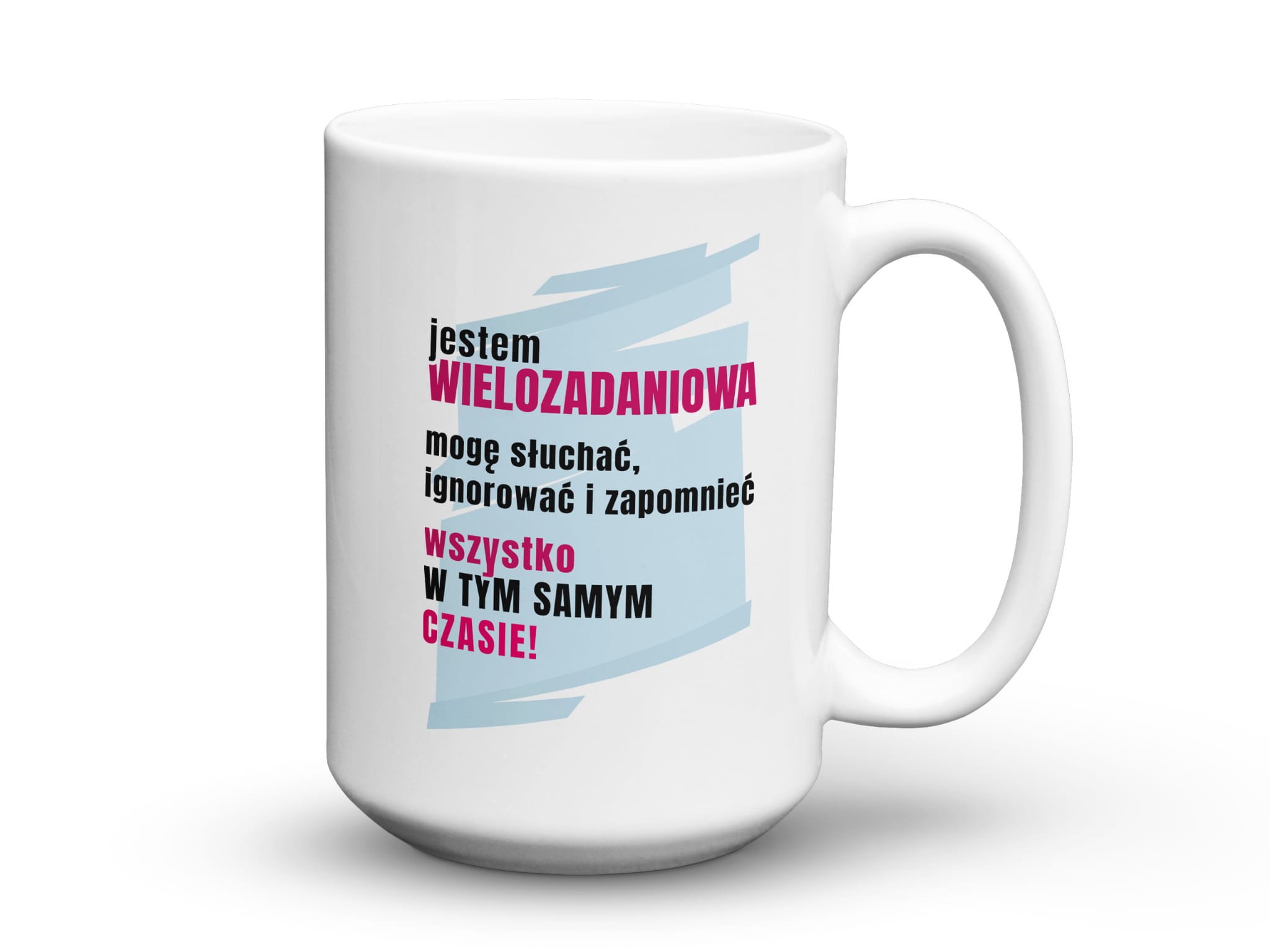Kubek z nadrukiem śmieszny do pracy. Jestem Wielozadaniowa. Mogę słuchać, ignorować i zapomnieć wszystko w tym samym czasie!