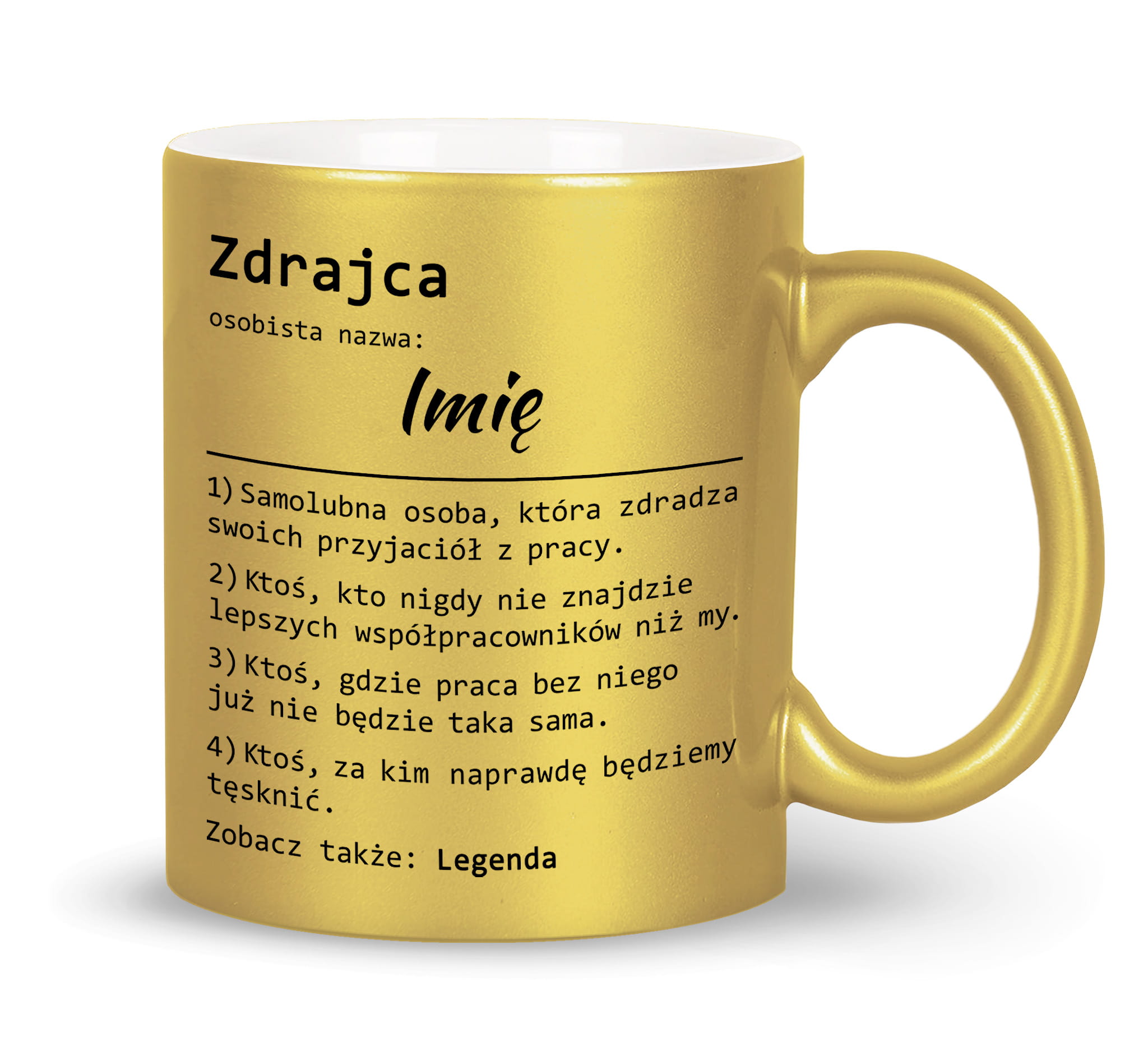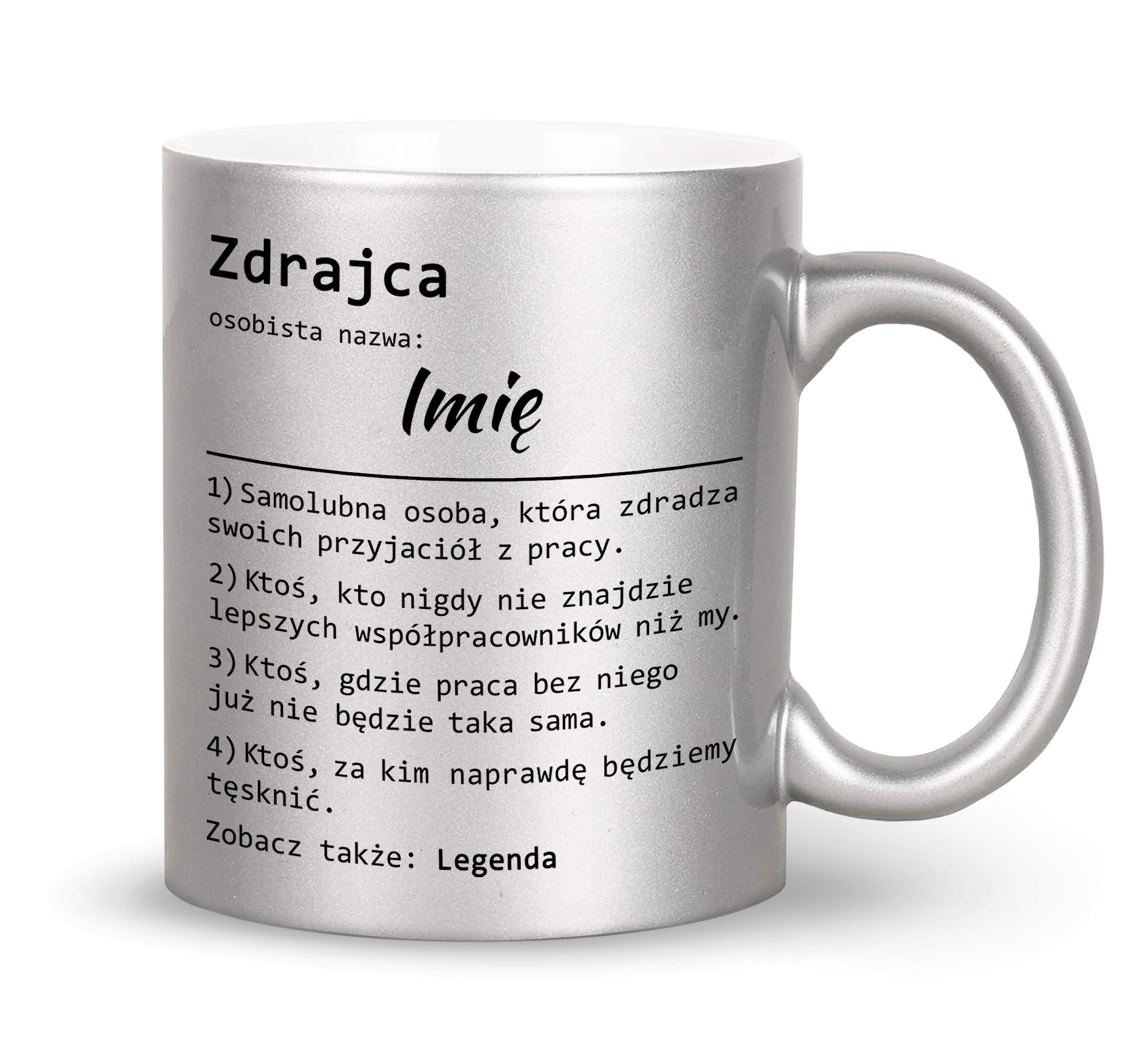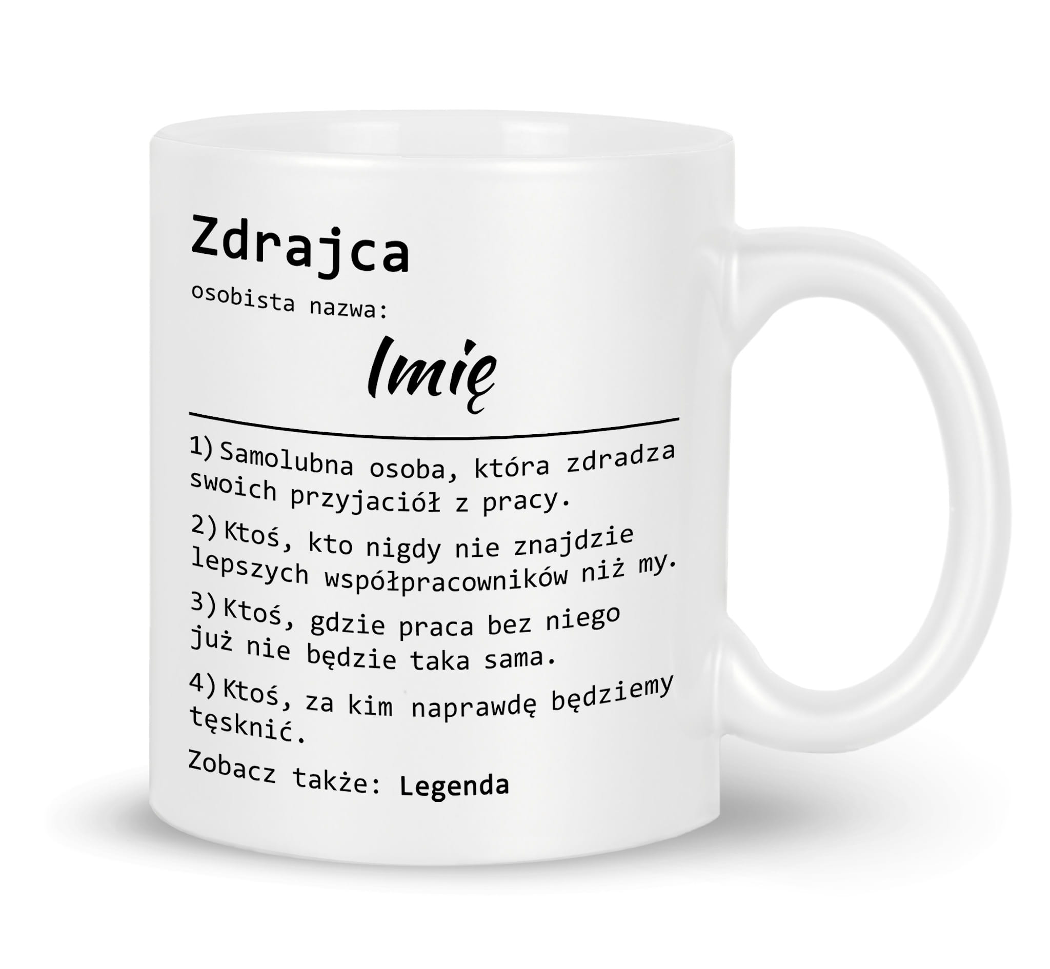 Kubek przedstawia humorystyczną definicję słowa "Zdrajca" w kontekście odejścia koleżanki kolegi z pracy.