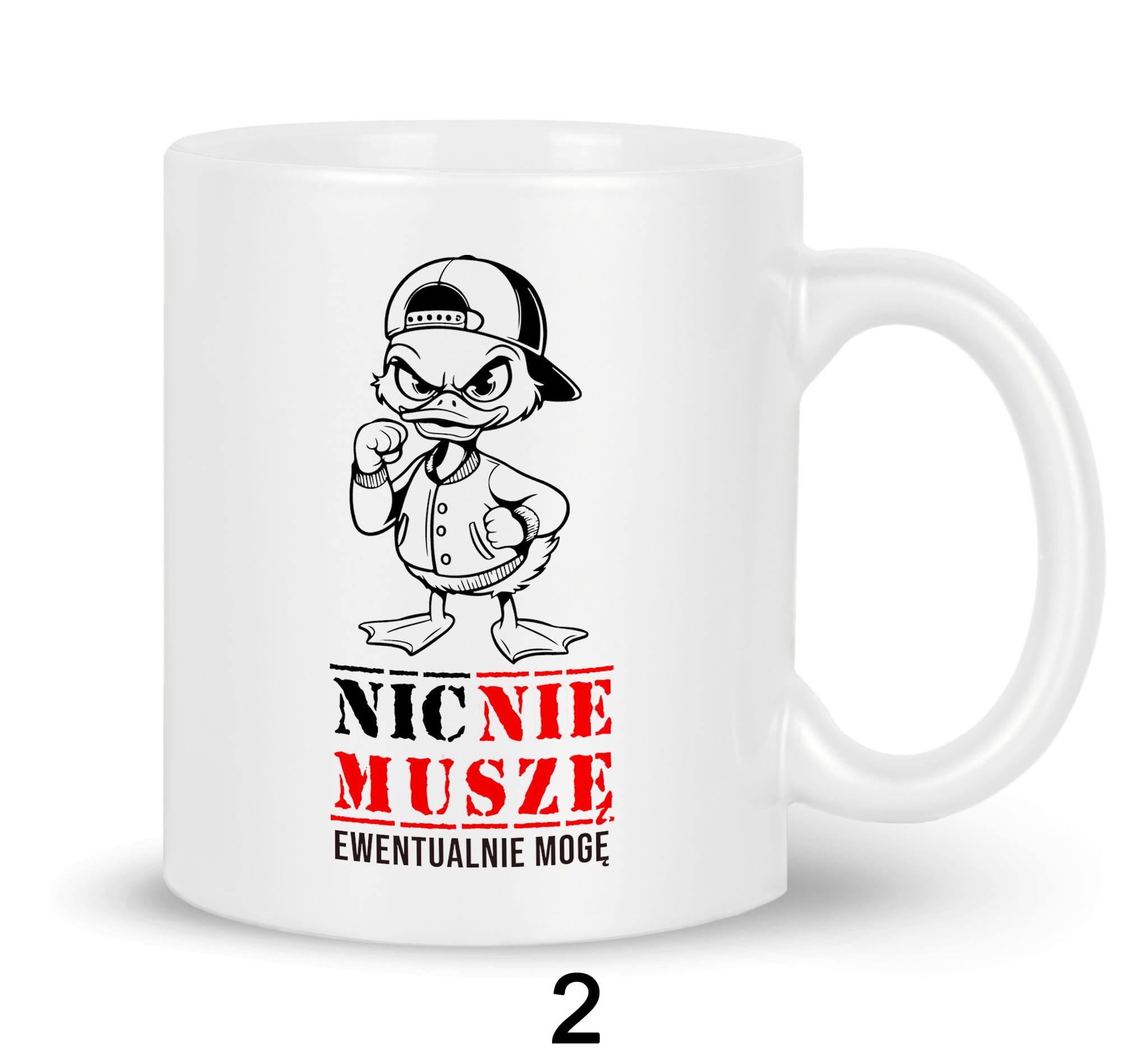 Nadruk na kubku przedstawia postać kaczki, w kurtce bejsbolówce. Poniżej grafiki znajduje się napis: "NIC NIE MUSZĘ EWENTUALNIE MOGĘ". Kubek jest wykonany metodą sublimacji, co zapewnia trwałość nadruku.