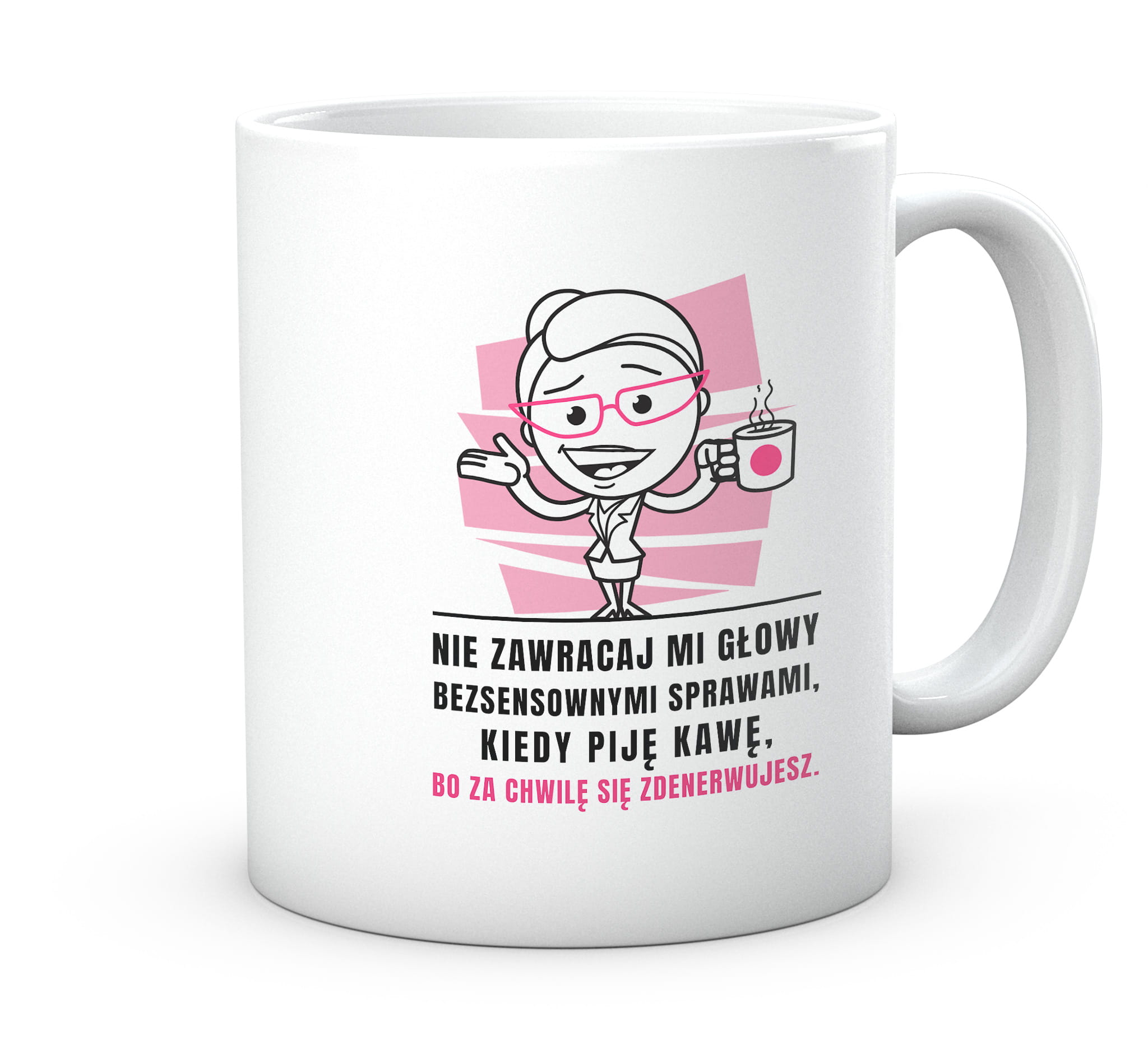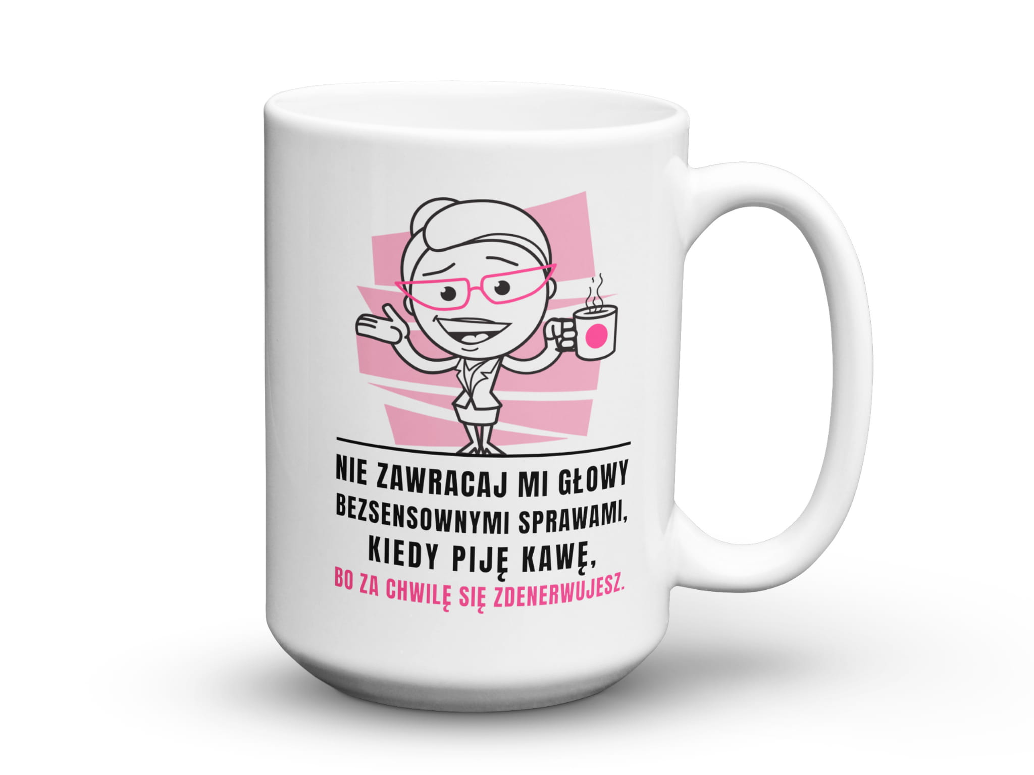 Kubek z nadrukiem grafiki prezent do pracy, biura dla Niej. Nie zawracaj mi głowy bezsensownymi sprawami, kiedy piję kawę, bo za chwilę się zdenerwujesz.