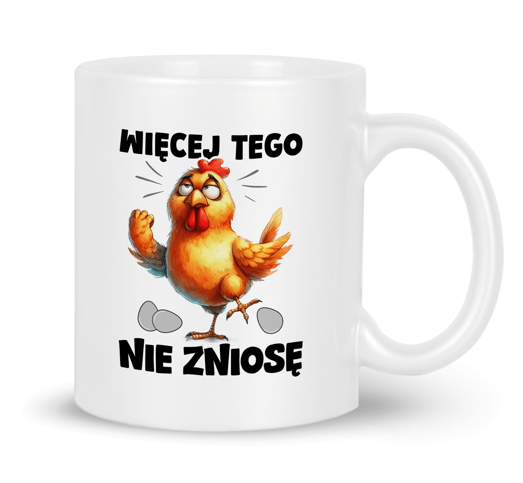 Kubek z grafiką śmiesznej kury i zabawnym napisym "WIĘCEJ TEGO NIE ZNIOSĘ".