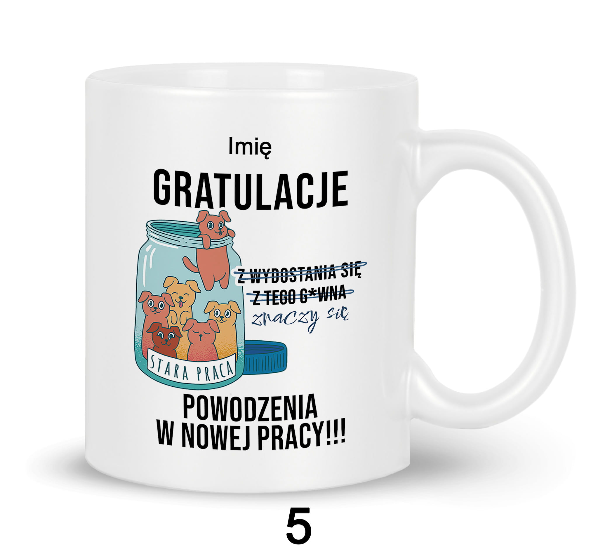 Kubek jest ceramiczny z nadrukiem tekstu i grafiki "GRATULACJE Z WYDOSTANIA SIĘ Z TEGO GÓWNA znaczy się POWODZENIA W NOWEJ PRACY!!!".