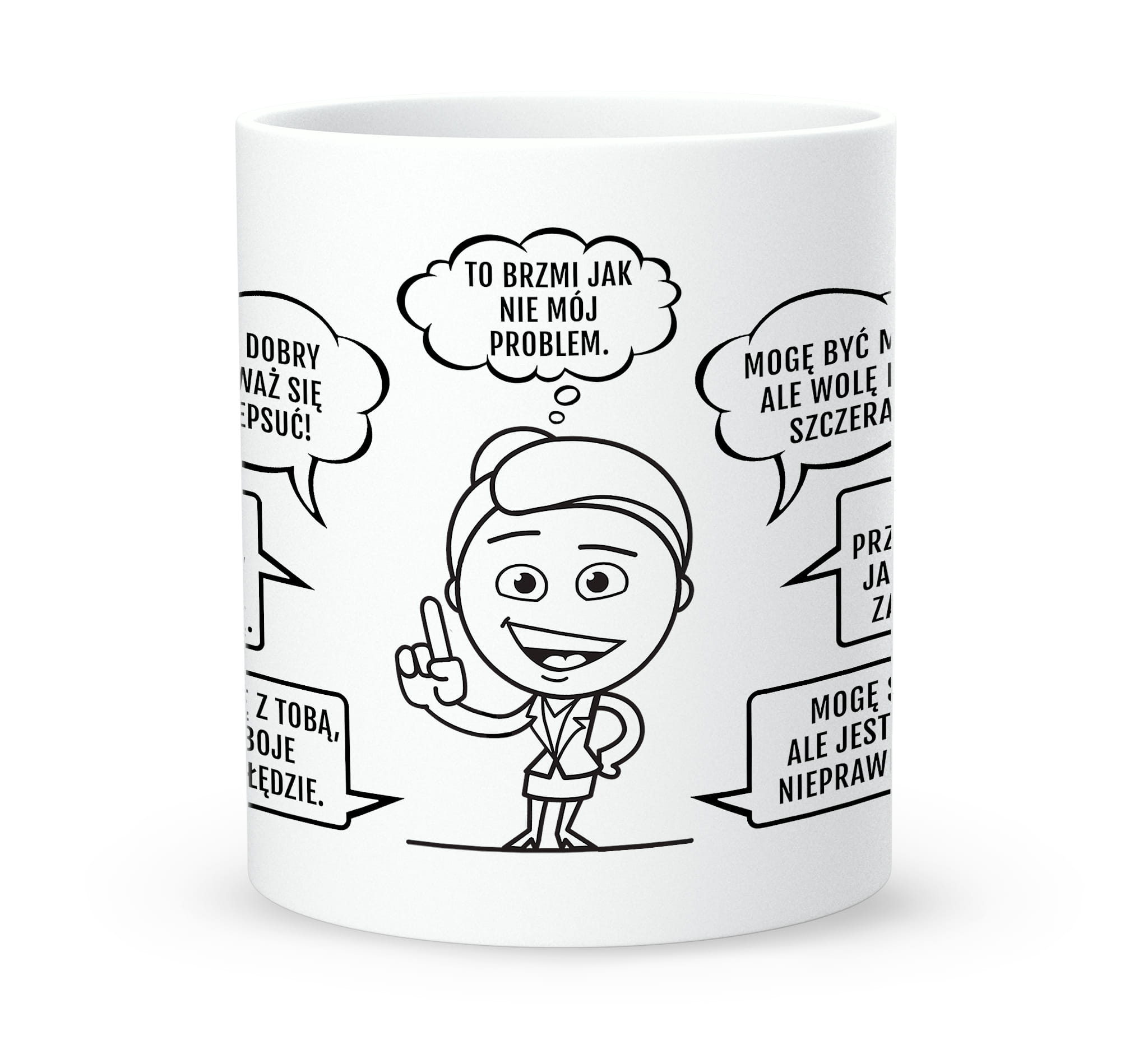 Grafiki na kubku przedstawia postać z kreskówki w otoczeniu dymków z ironicznymi i asertywnymi powiedzeniami, wyrażającymi sarkastyczne podejście do pracy i interakcji międzyludzkich. Teksty na kubku to zabawne biurowe, popularne cytaty wykorzystywane w formie memów, często drukowane na gadżetach, takich jak kubki, by wyrazić humorystyczne podejście do pracy i życia.