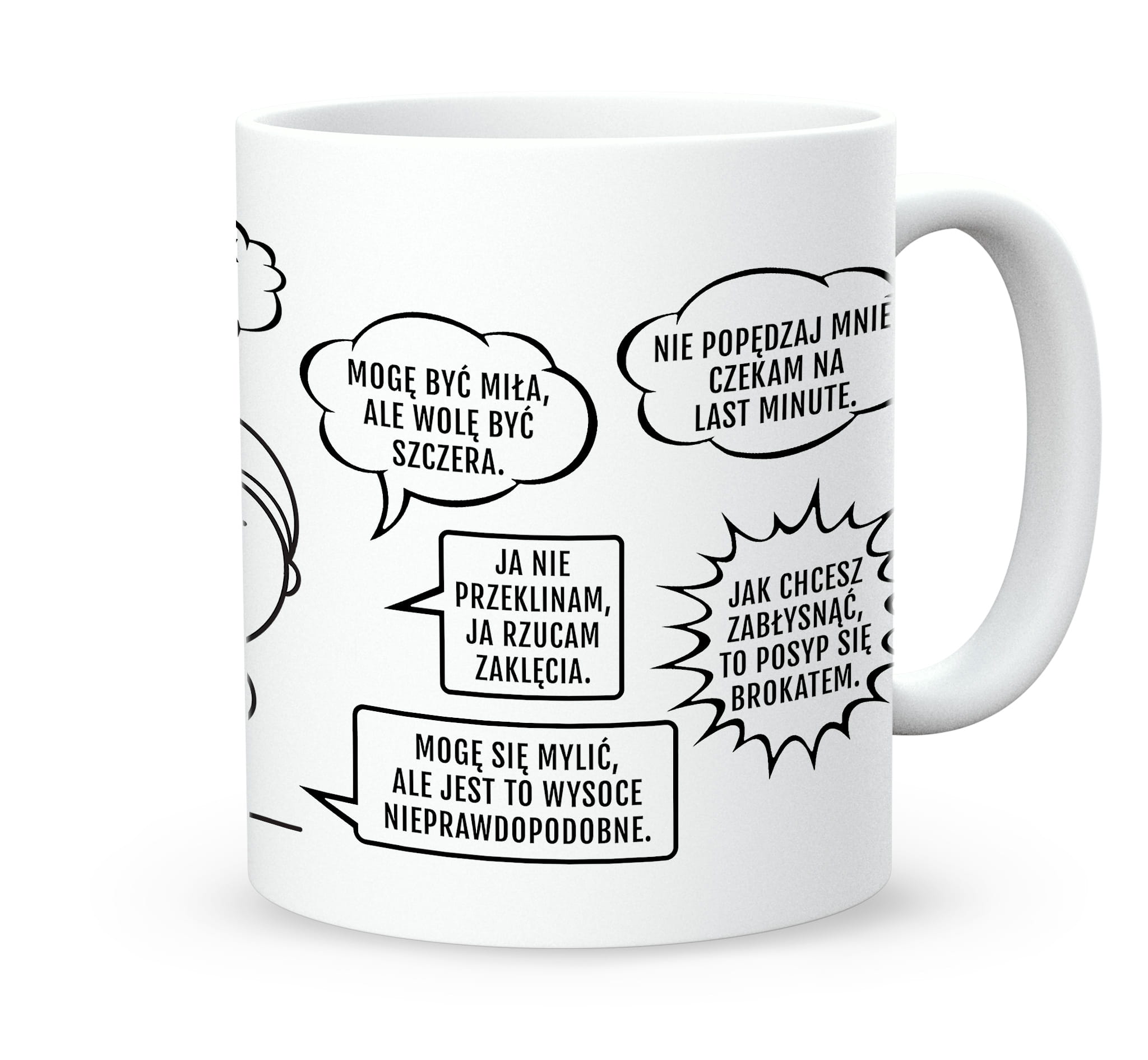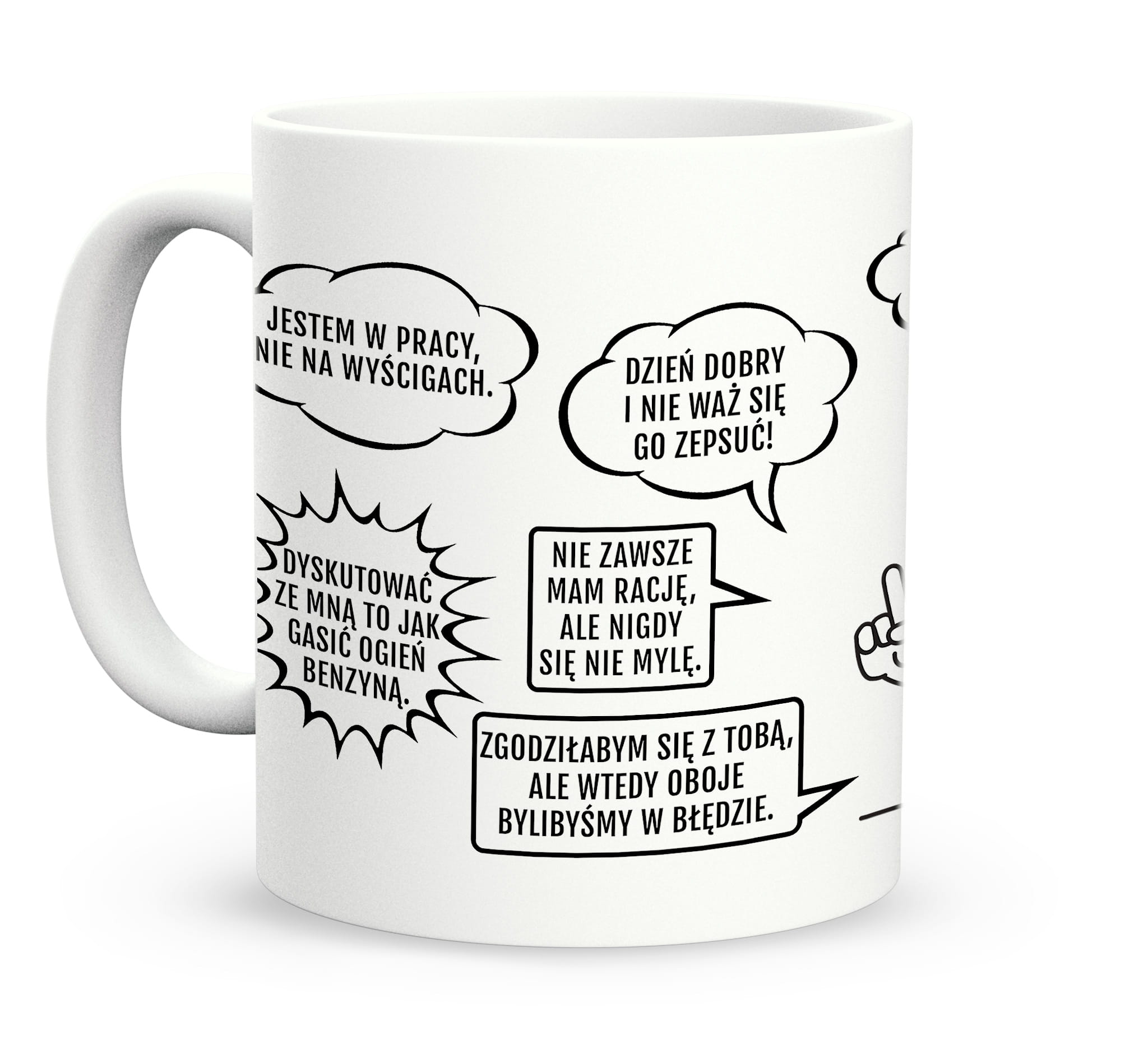 Kubek do kawy dla kobiety z humorystycznym nadrukiem cytatów memów grafiki. Zabawny upominek do pracy.