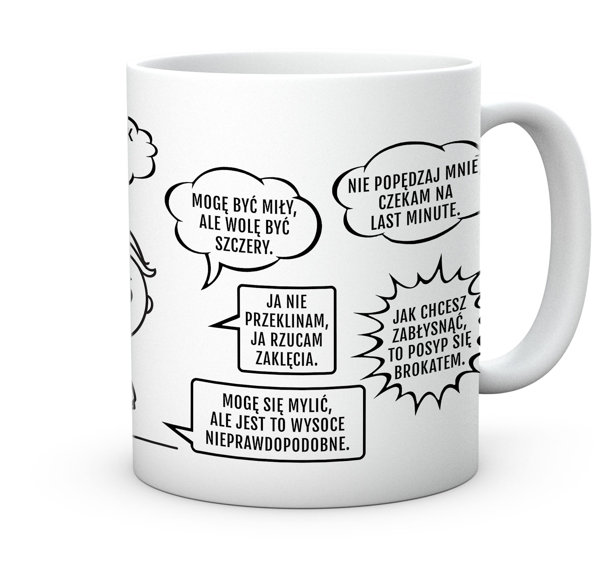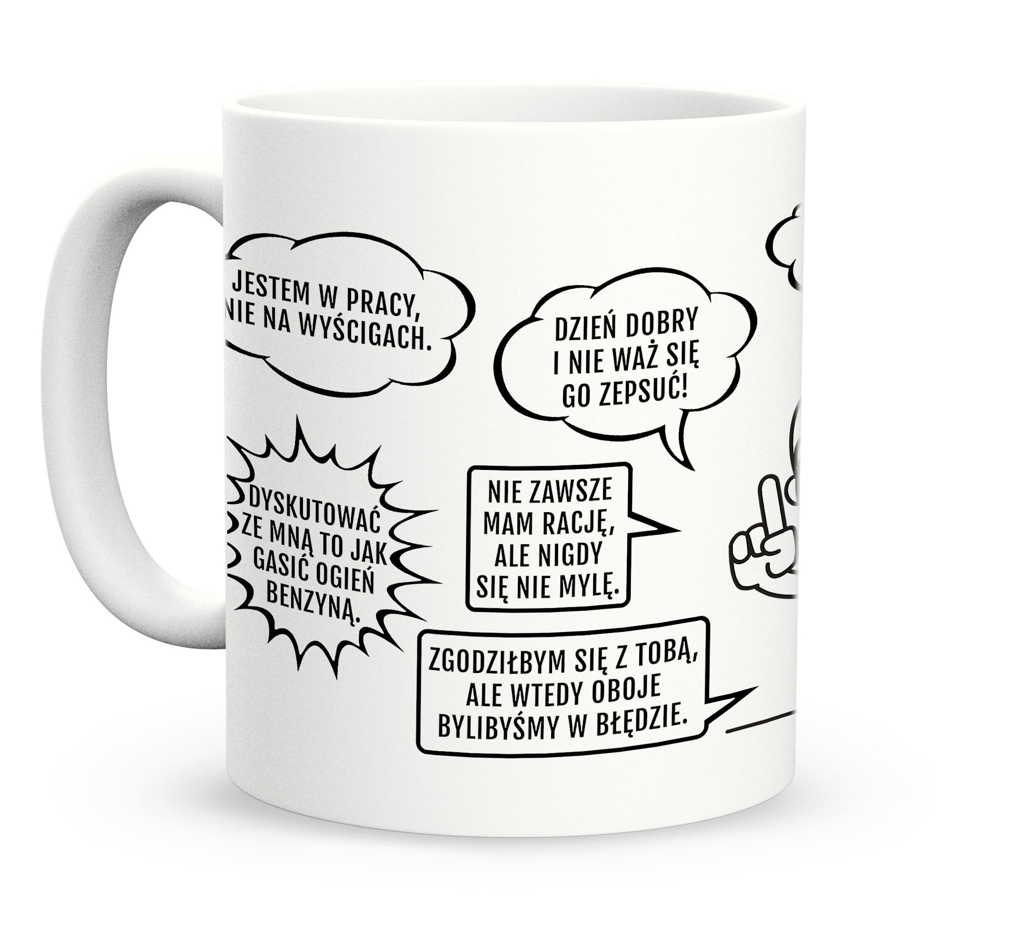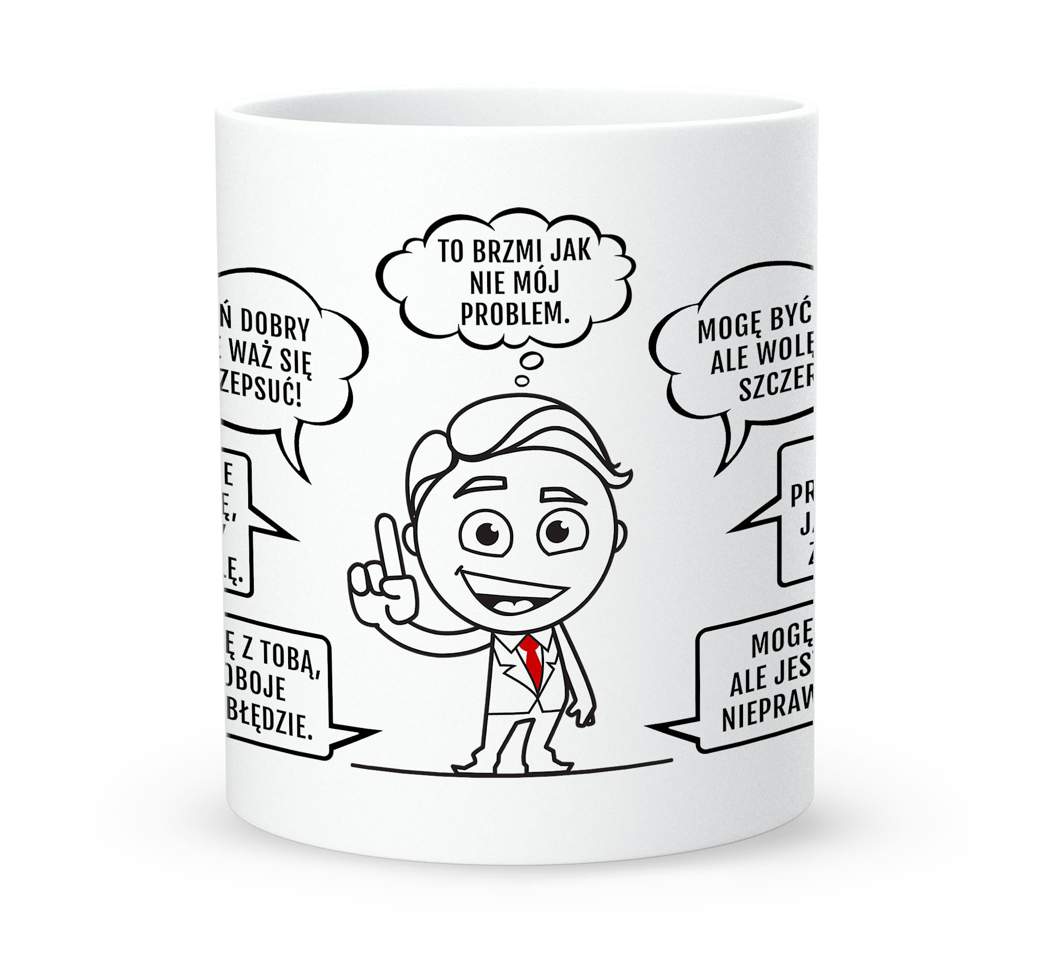 Kubek do kawy dla mężczyzny z humorystycznym nadrukiem cytatów memów grafiki. Zabawny upominek do pracy.