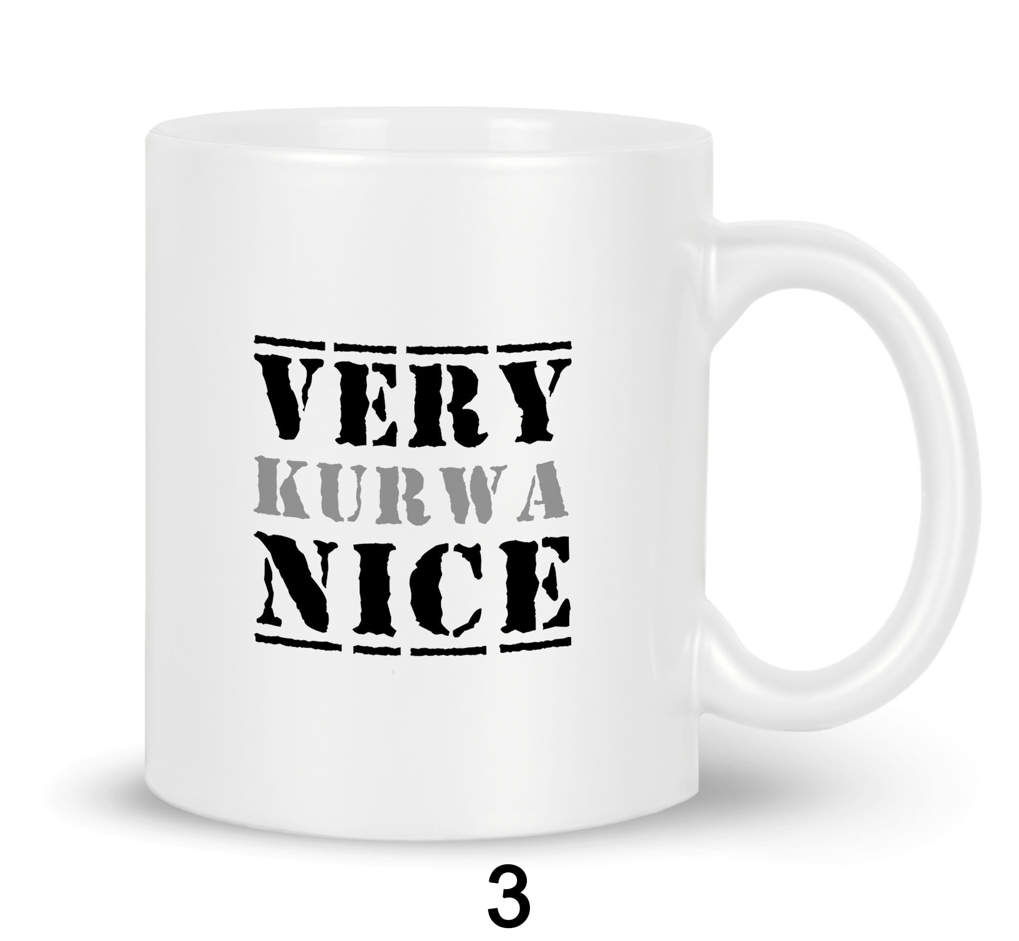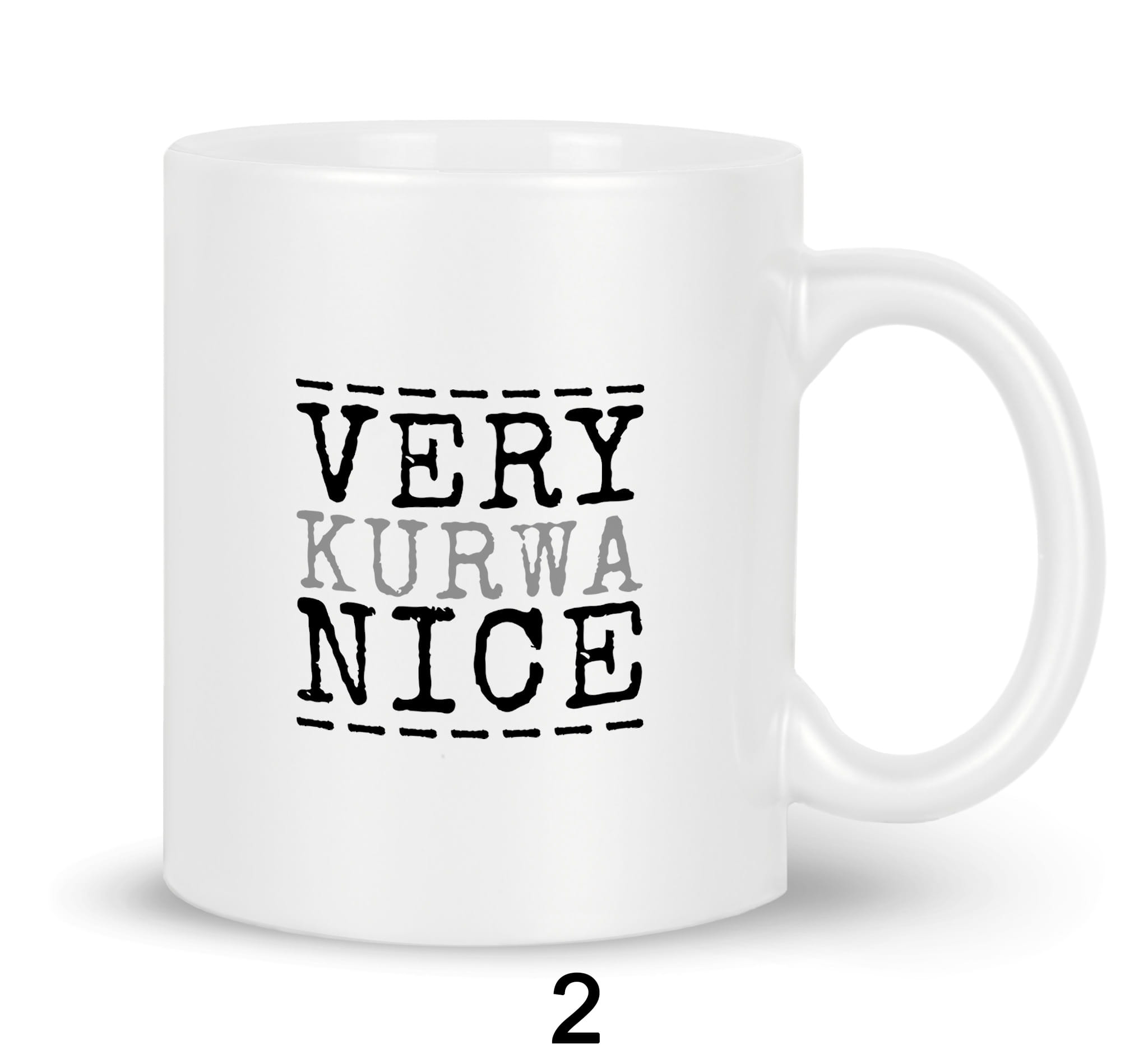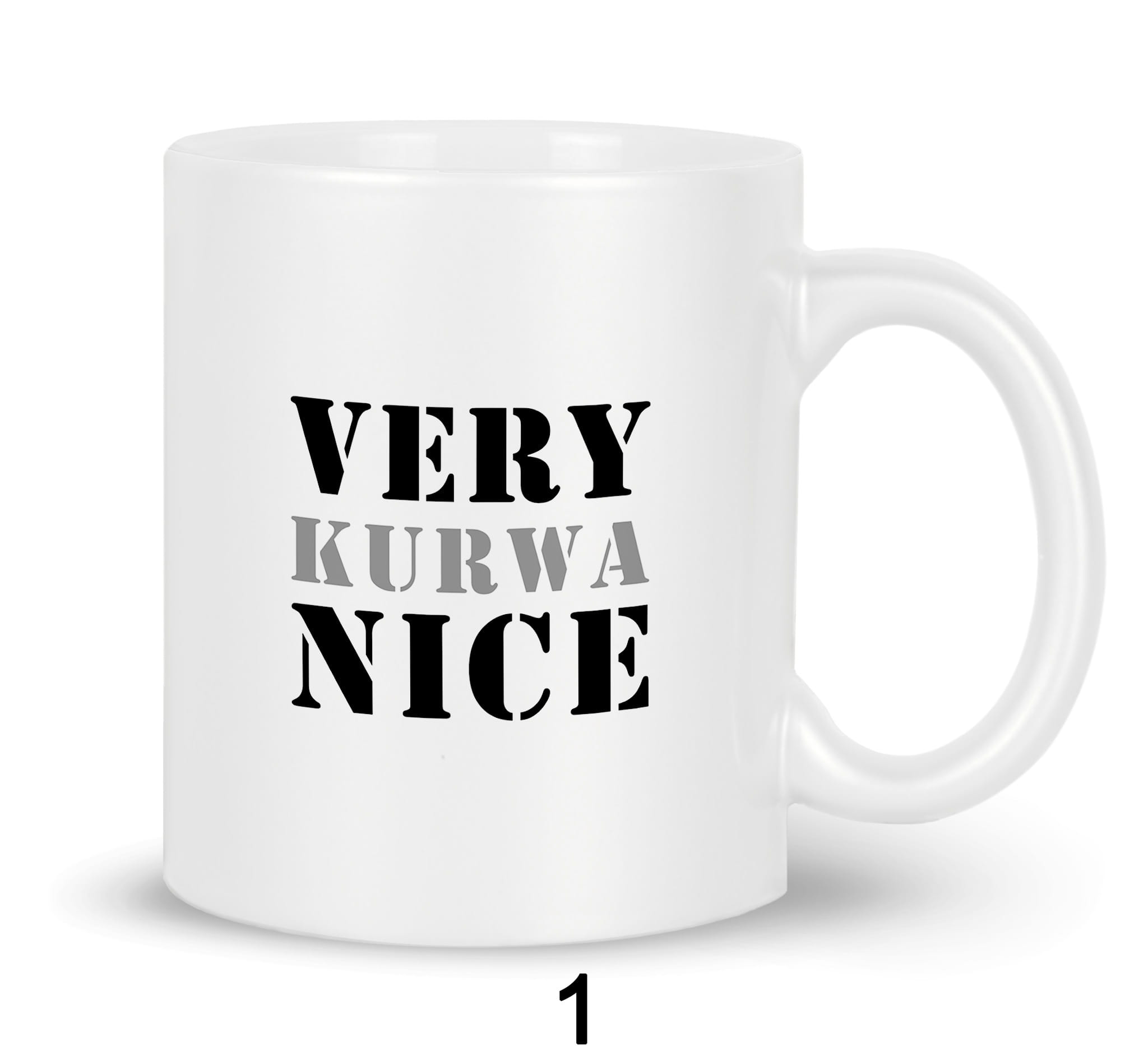 Napis na kubku łączy angielskie słowa "very" i "nice" z polskim wulgaryzmem "kur*a". Jest to popularny produkt, często kupowany jako zabawny prezent. To niezwykle praktyczny i równocześnie oryginalny sposób na poprawę nastroju podczas porannej kawy.