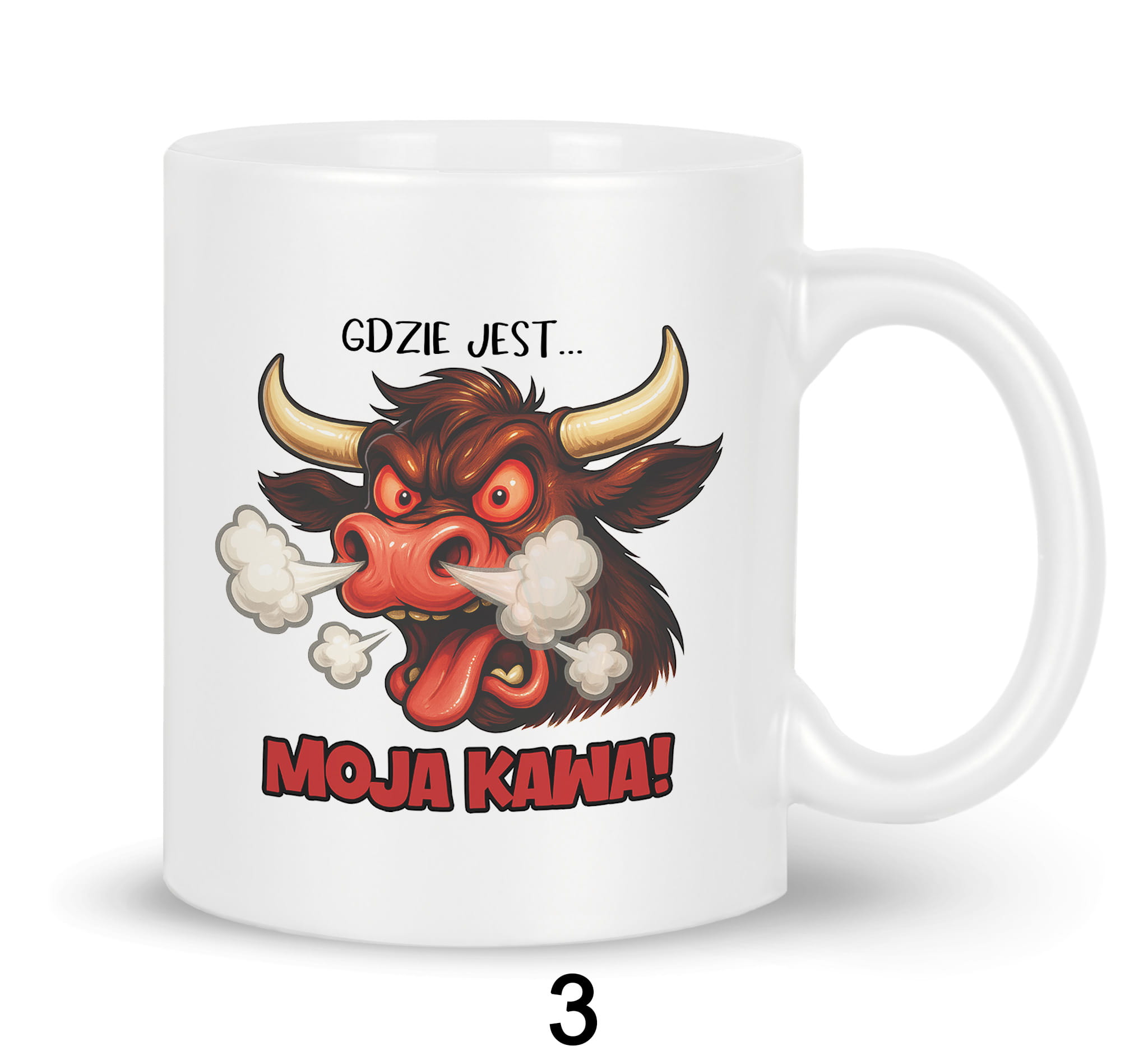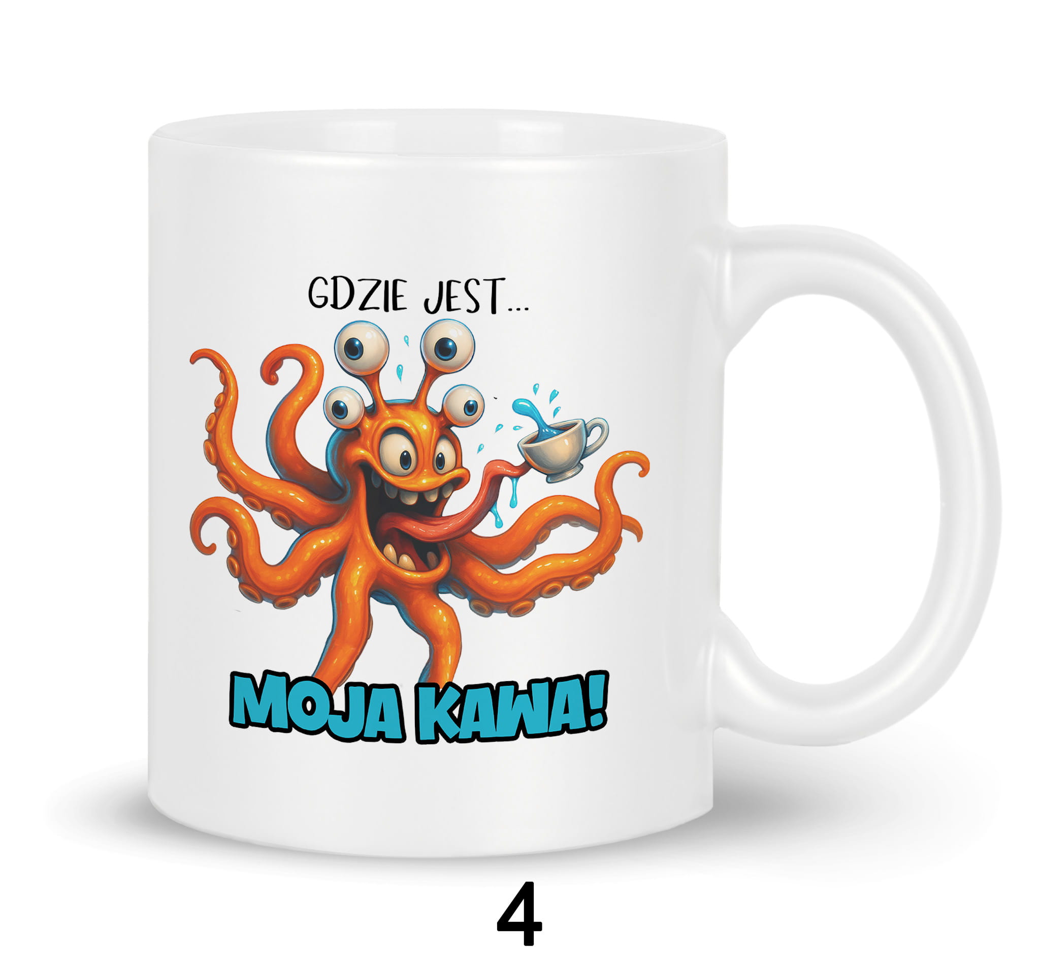 Nadruk na kubkach przedstawia śmieszne zabawne zwierzątka z podpisem "GDZIE JEST... MOJA KAWA!".
