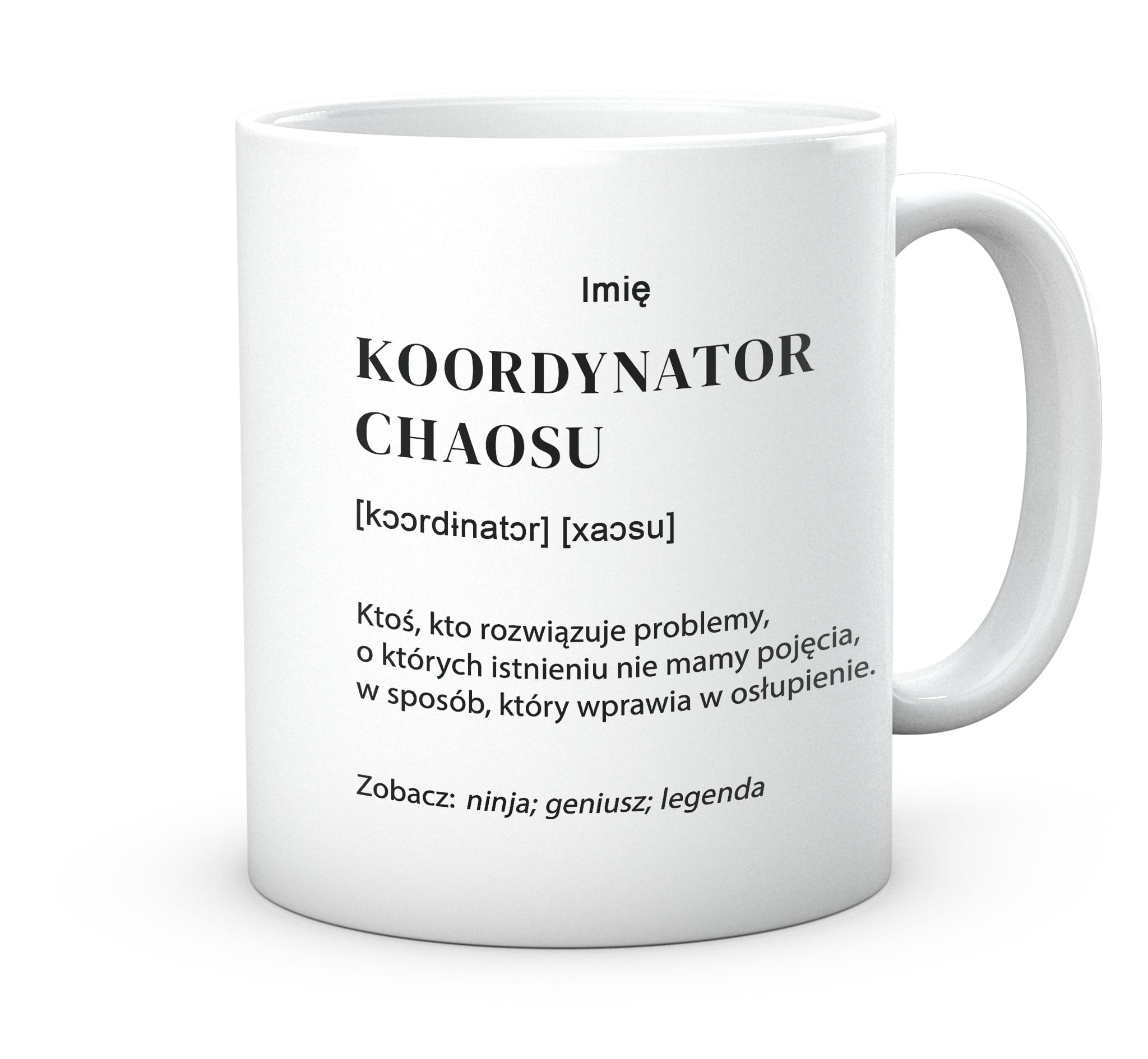 Prezentowany kubek dla kolegi z pracy KOORDYNATOR CHAOSU to zabawny prezent, który idealnie sprawdzi się na prezent.
