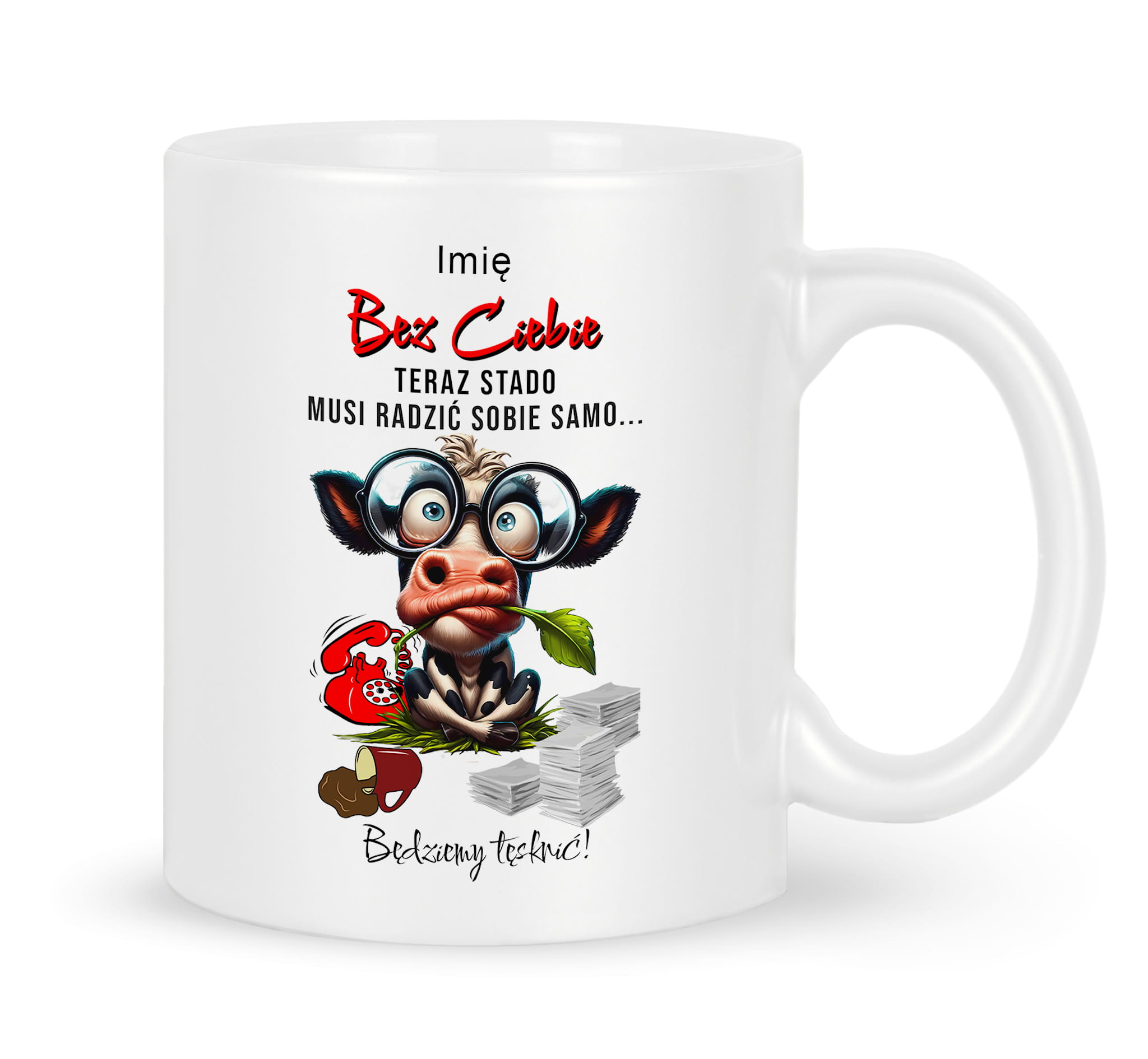 Kubek z nadrukiem grafiki i tekstu "Bez Ciebie teraz stado musi radzić sobie samo".