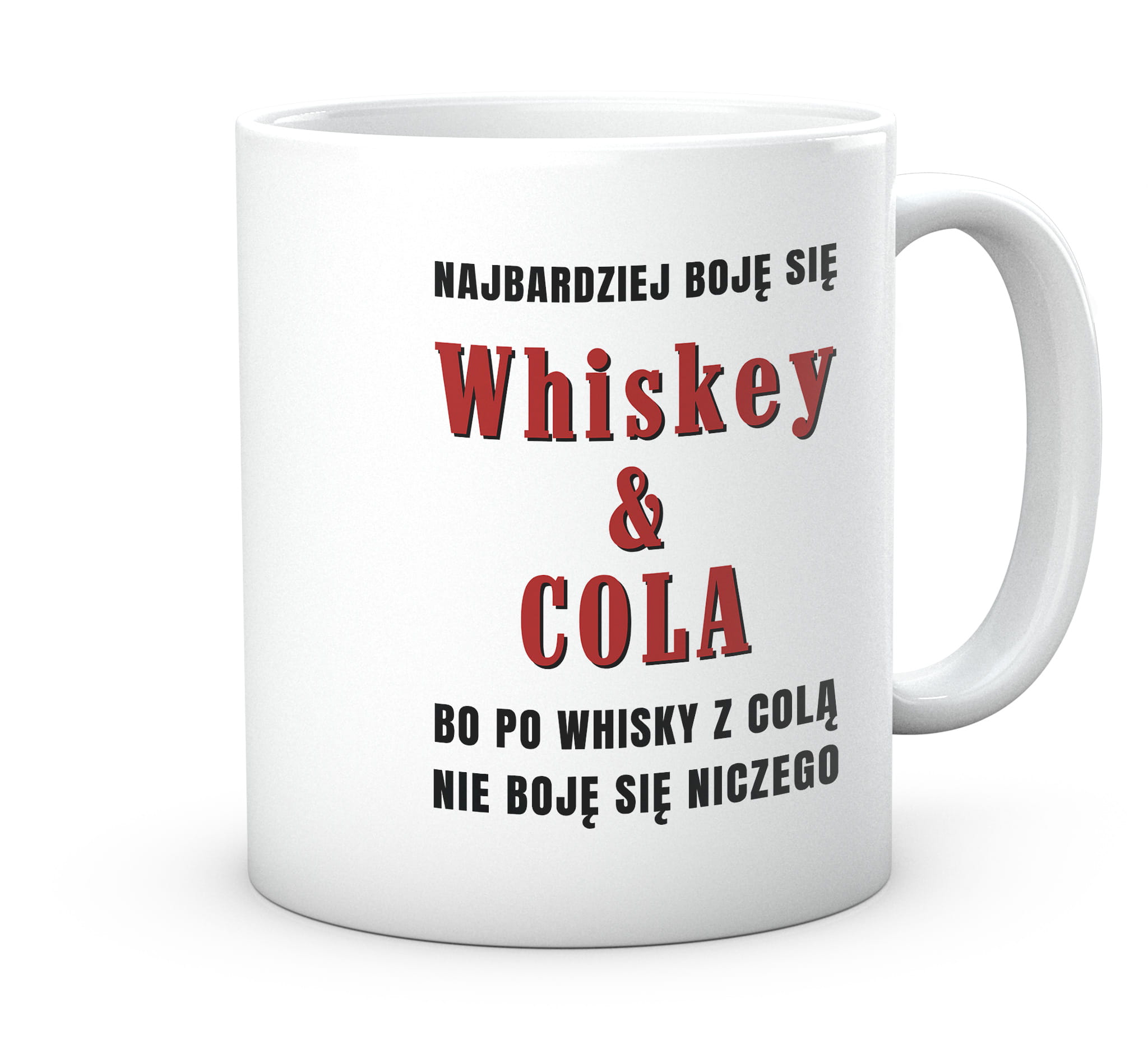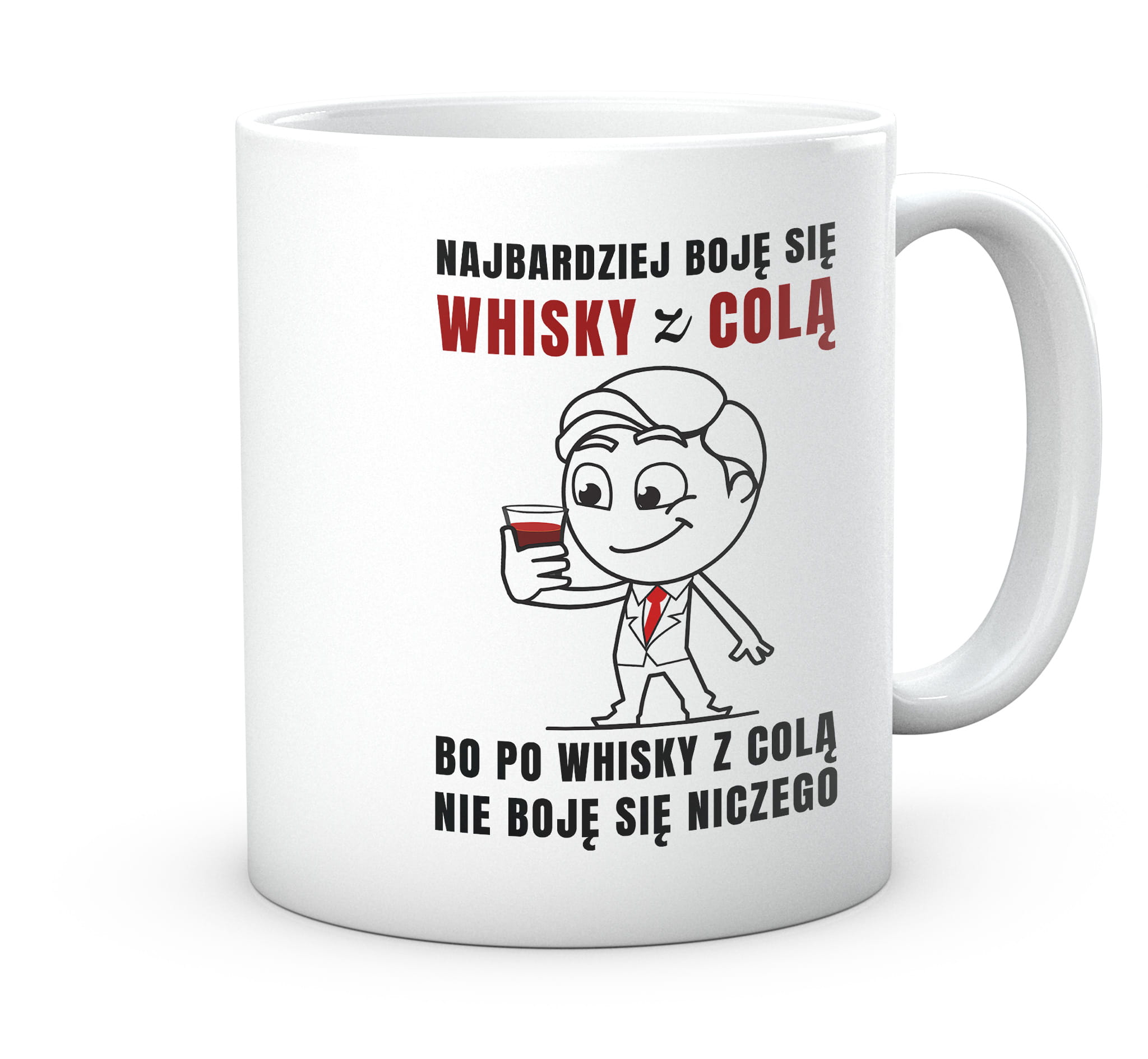 Najbardziej boję się whisky z colą bo po whisky z colą nie boję się niczego. Kubek śmieszny zabawny nadruk.