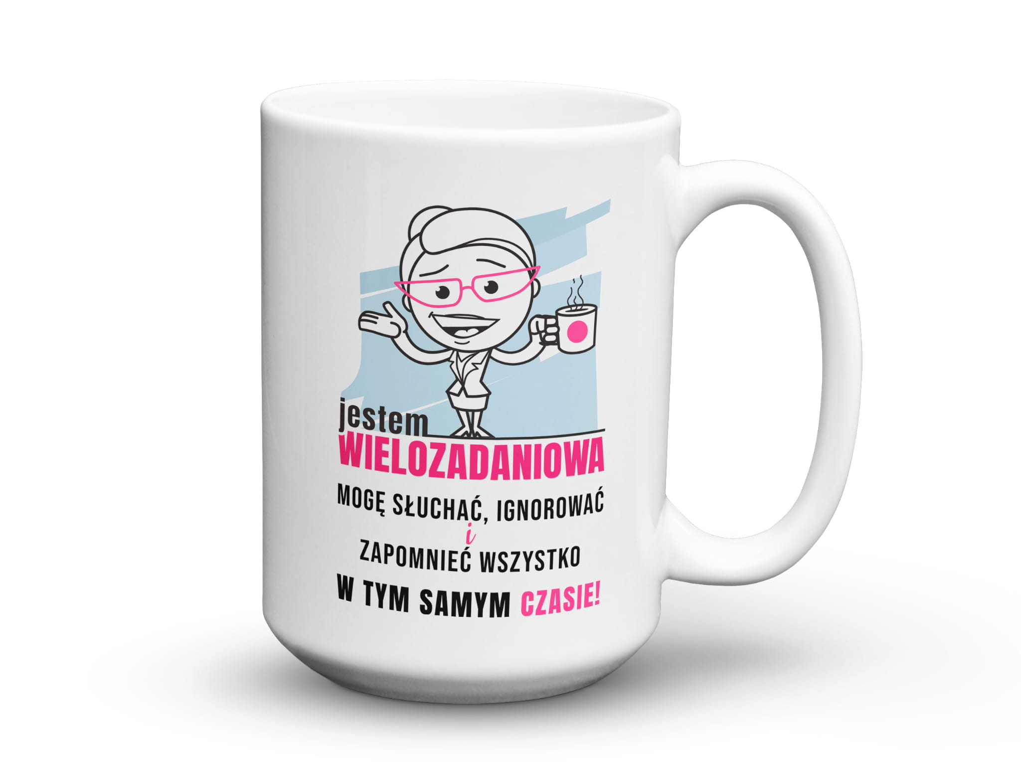 Kubek z nadrukiem śmieszny do pracy. Jestem Wielozadaniowa. Mogę słuchać, ignorować i zapomnieć wszystko w tym samym czasie!