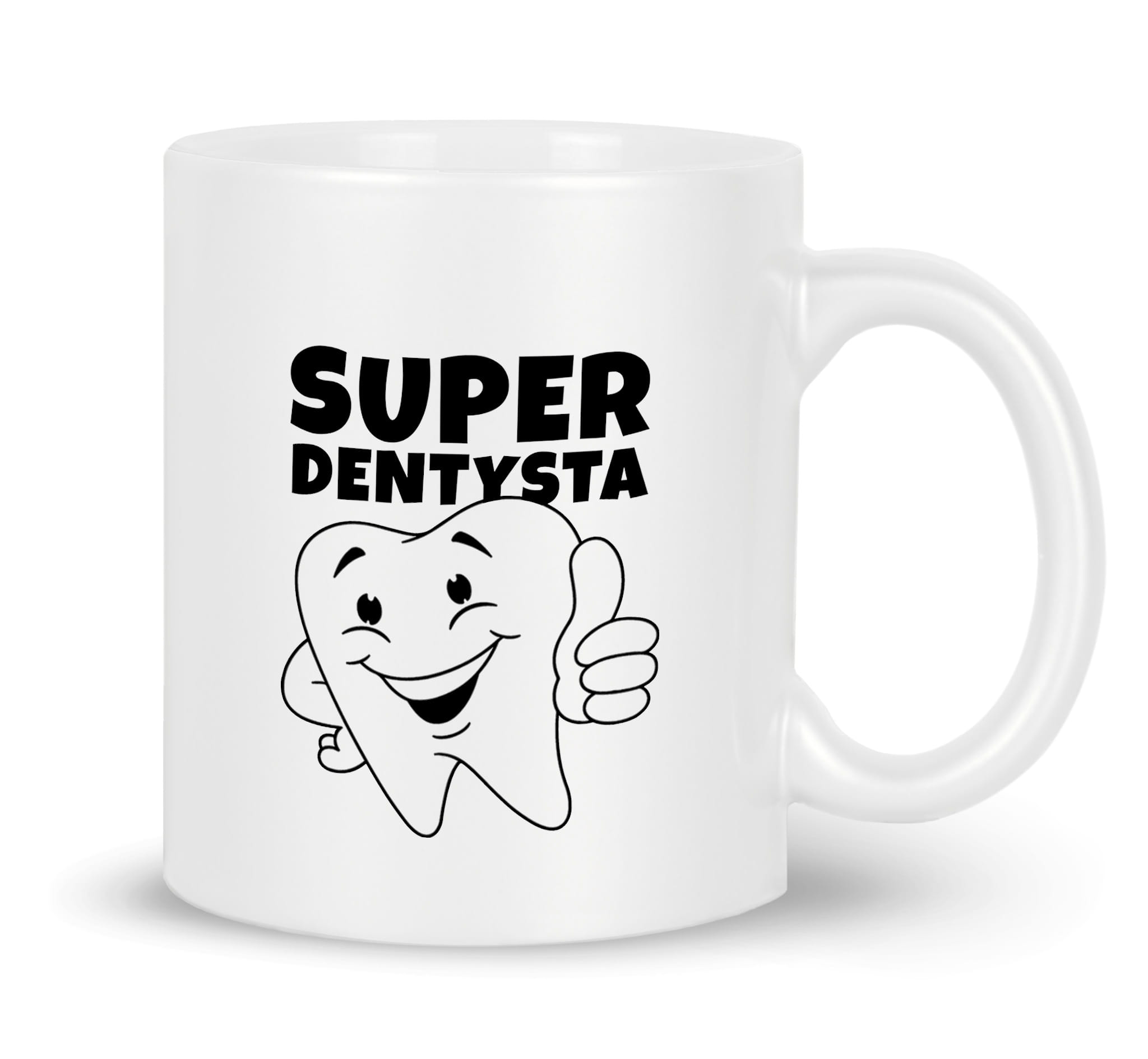 Kubek z napisem "SUPER DENTYSTA" oraz grafiką uśmiechniętego zęba z kciukiem w górę. Jest to popularny pomysł na prezent dla dentysty.