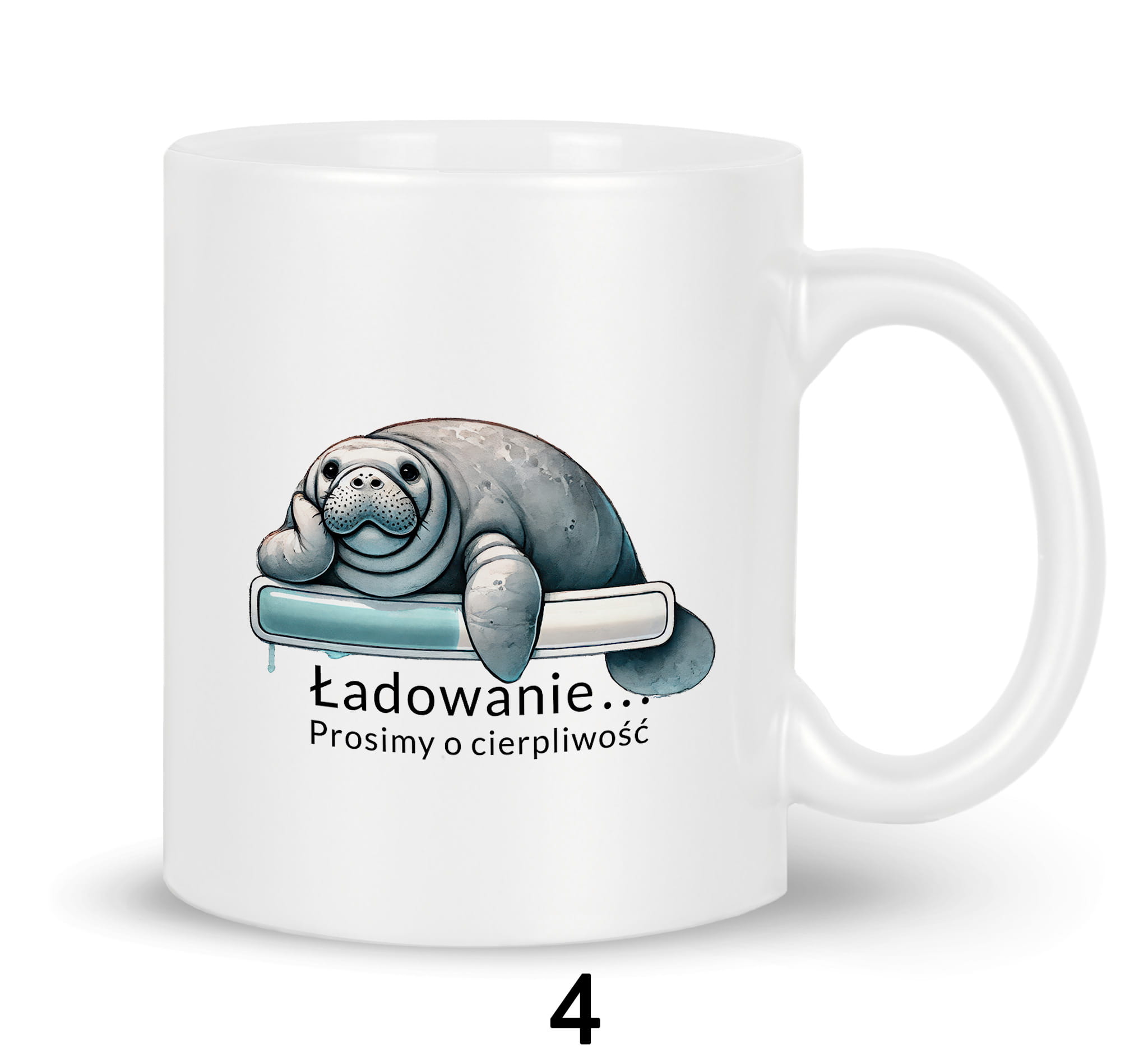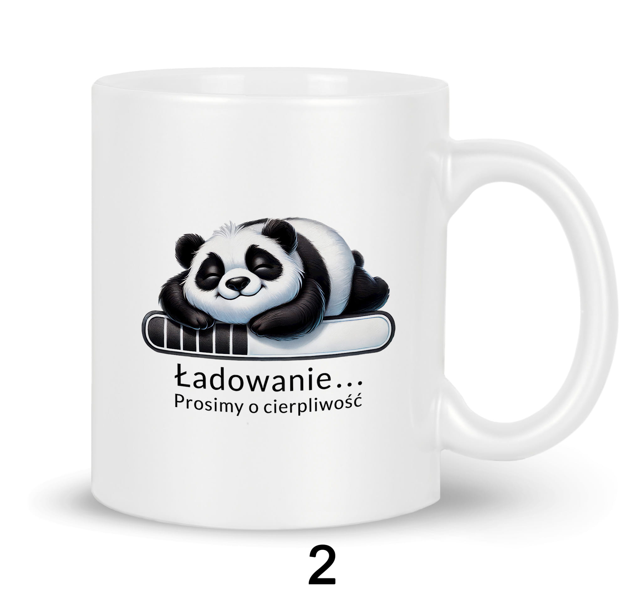 Nadruk na kubku przedstawia śmieszne zabawne zwierzątka leżące na pasku ładowania z napisem "Ładowanie... Prosimy o cierpliwość".