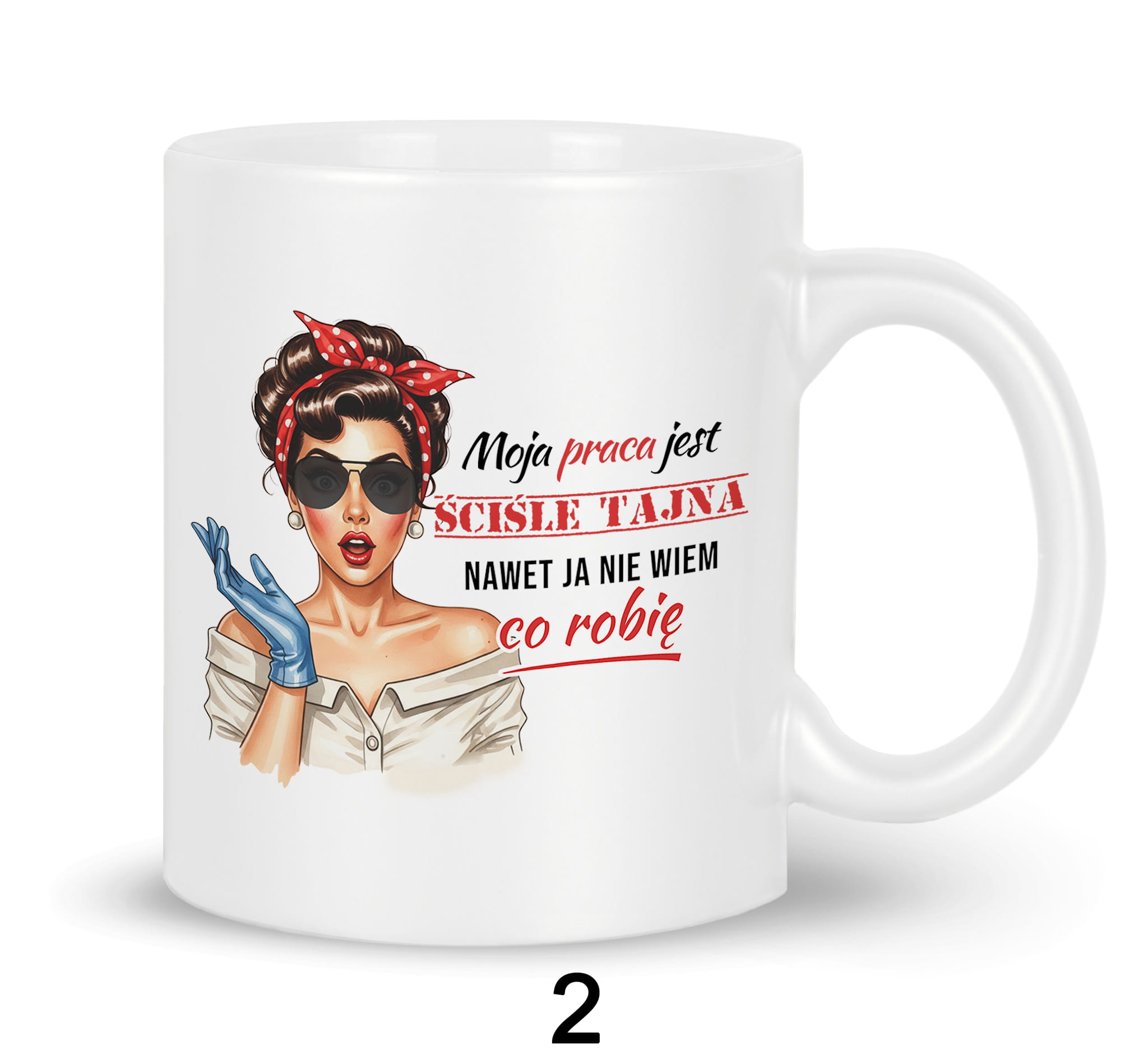 Ceramiczny kubek na prezent z nadrukiem grafiki i tekstu kobiety w stylu pin-up. Grafika przedstawia postać kobiety w stylu pin-up z lat 50., co jest często wykorzystywanym motywem w popkulturze do ozdabiania przedmiotów codziennego użytku.