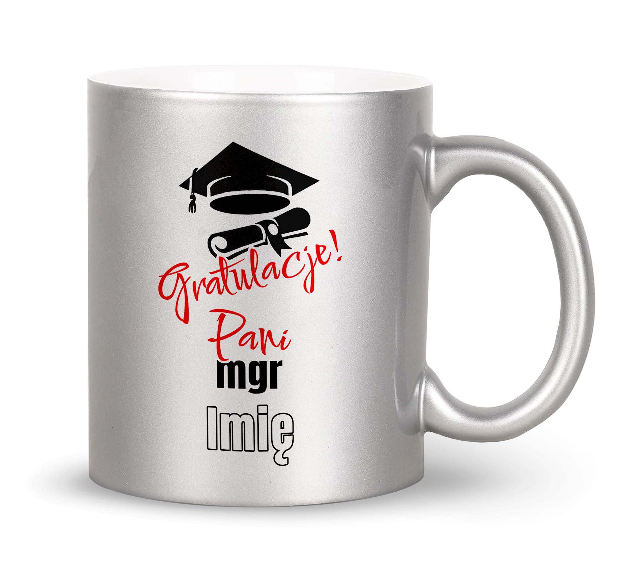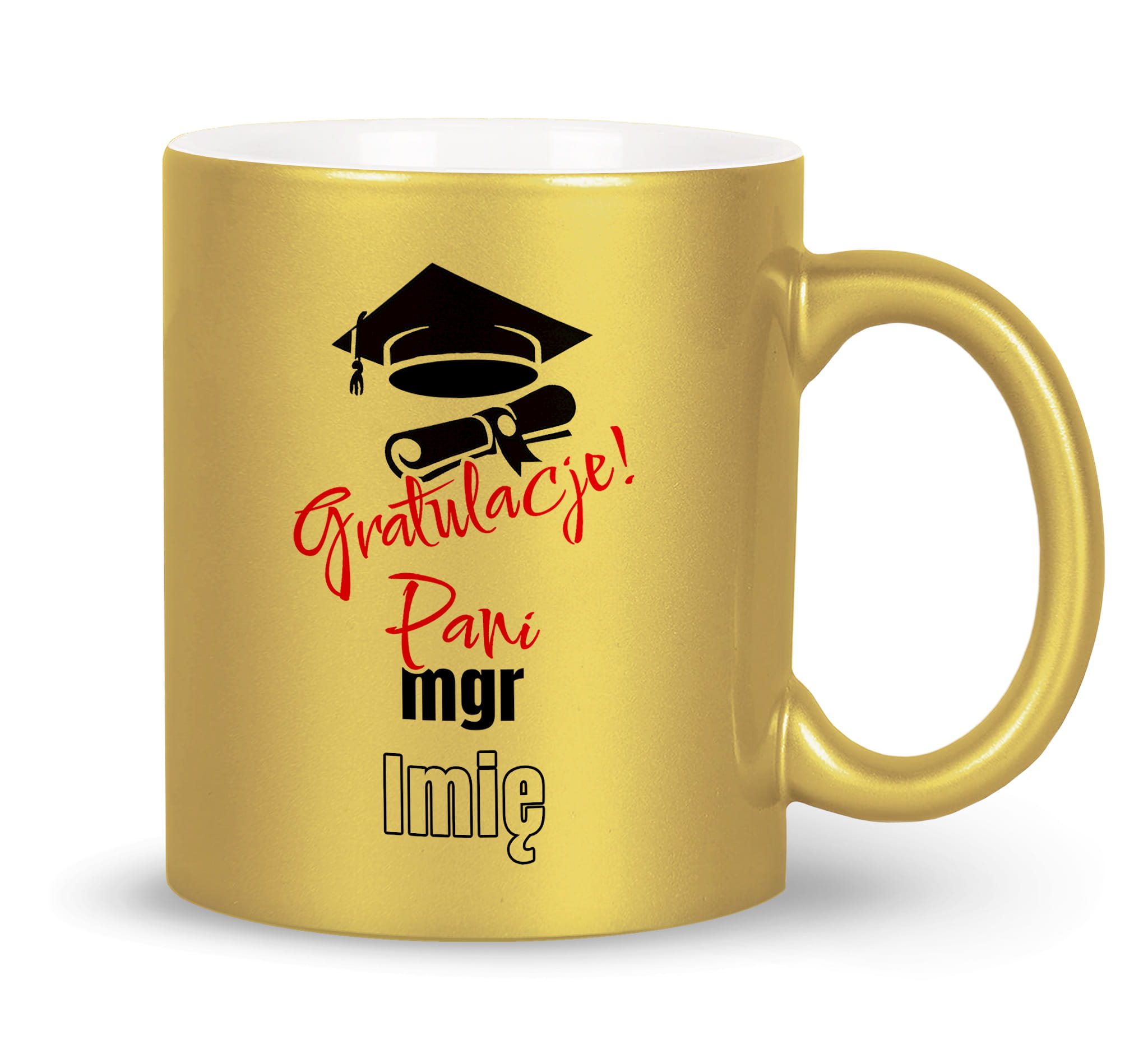 Kubek z napisem "Gratulacje! Pani mgr". To idealny prezent, który można podarować absolwentce studiów magisterskich.