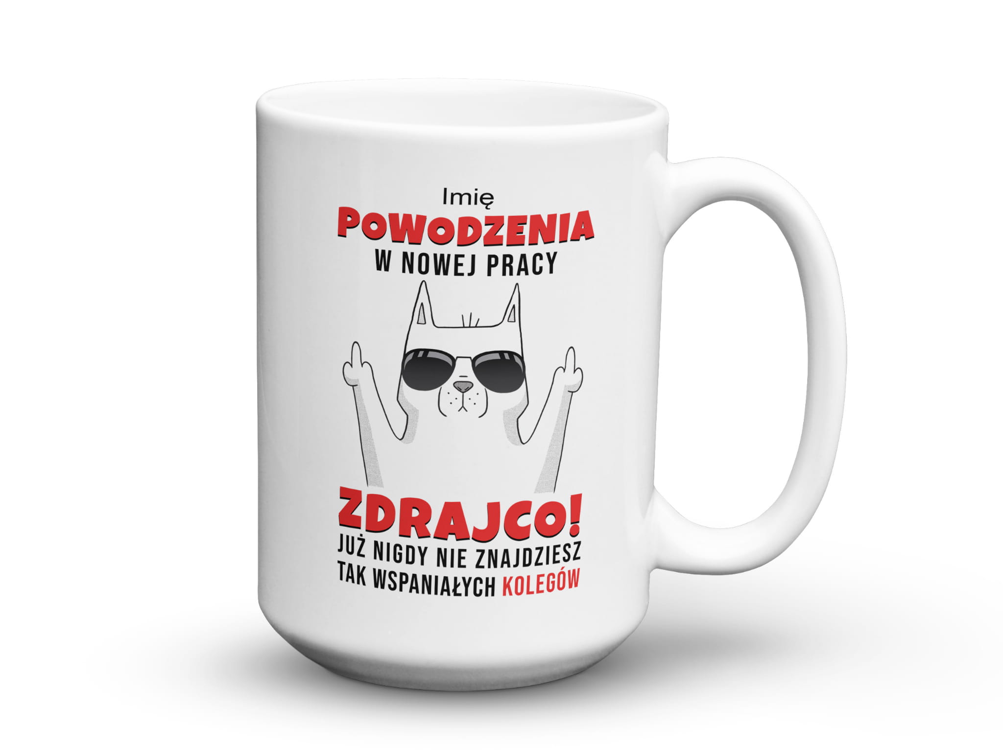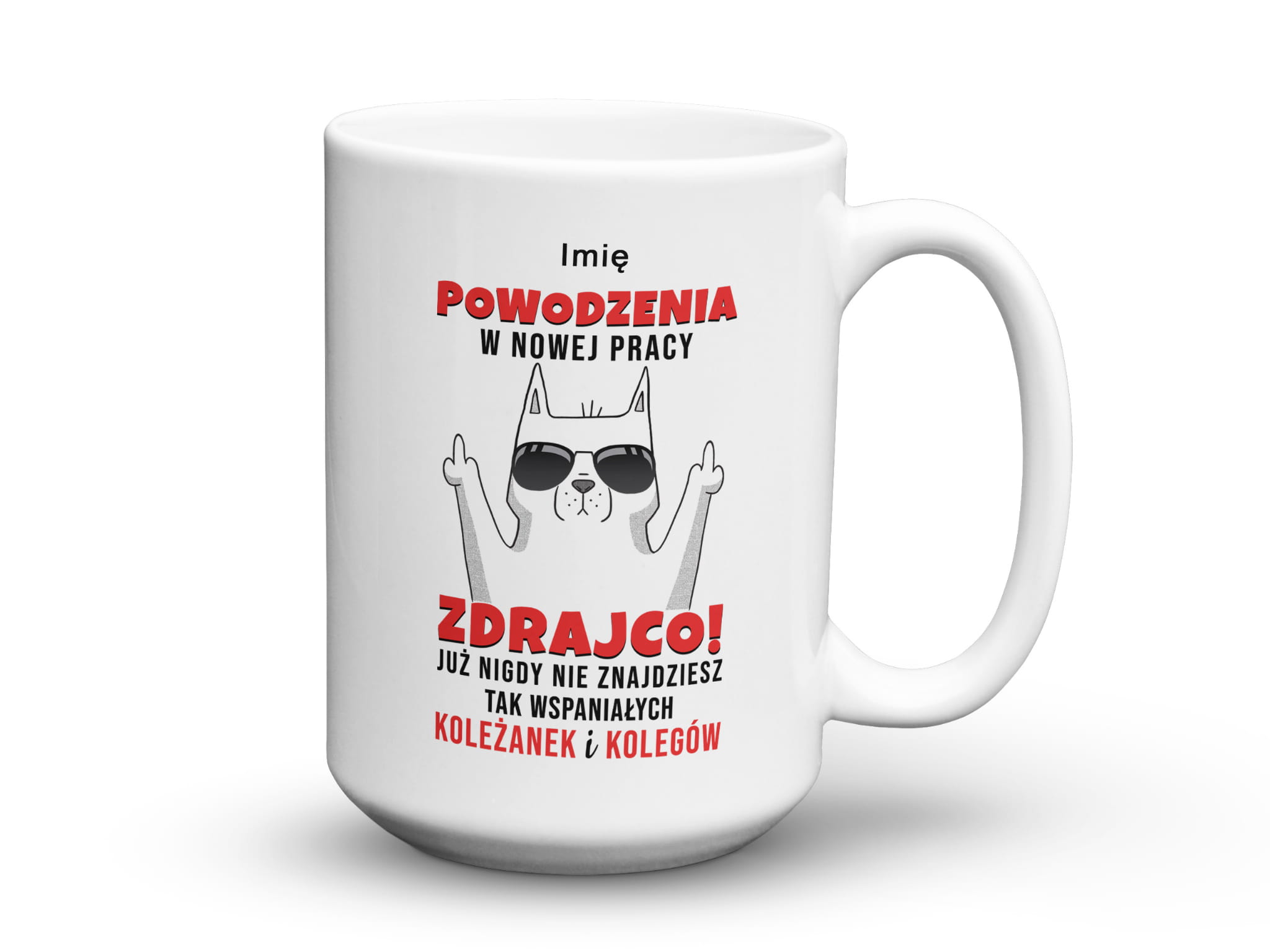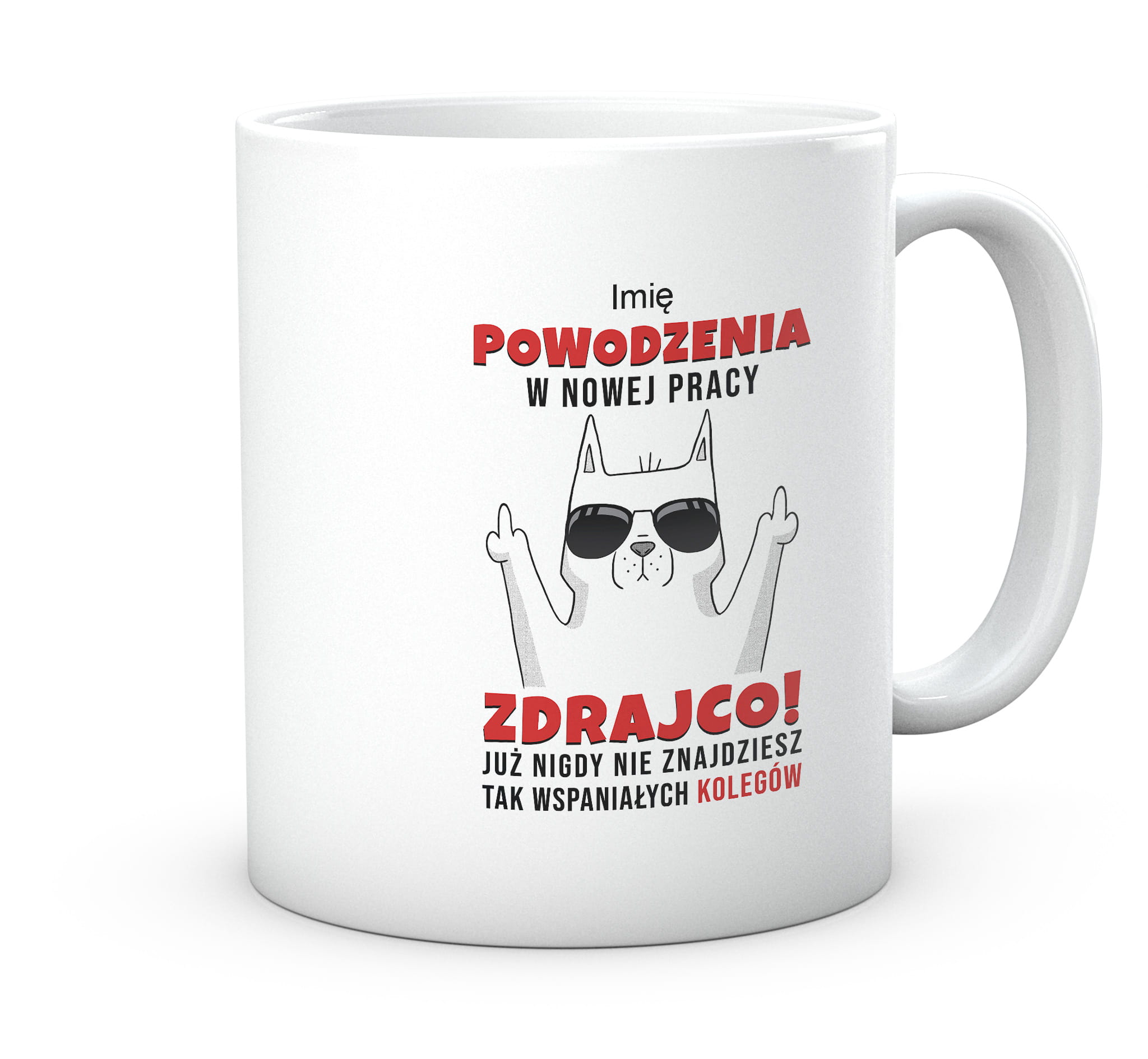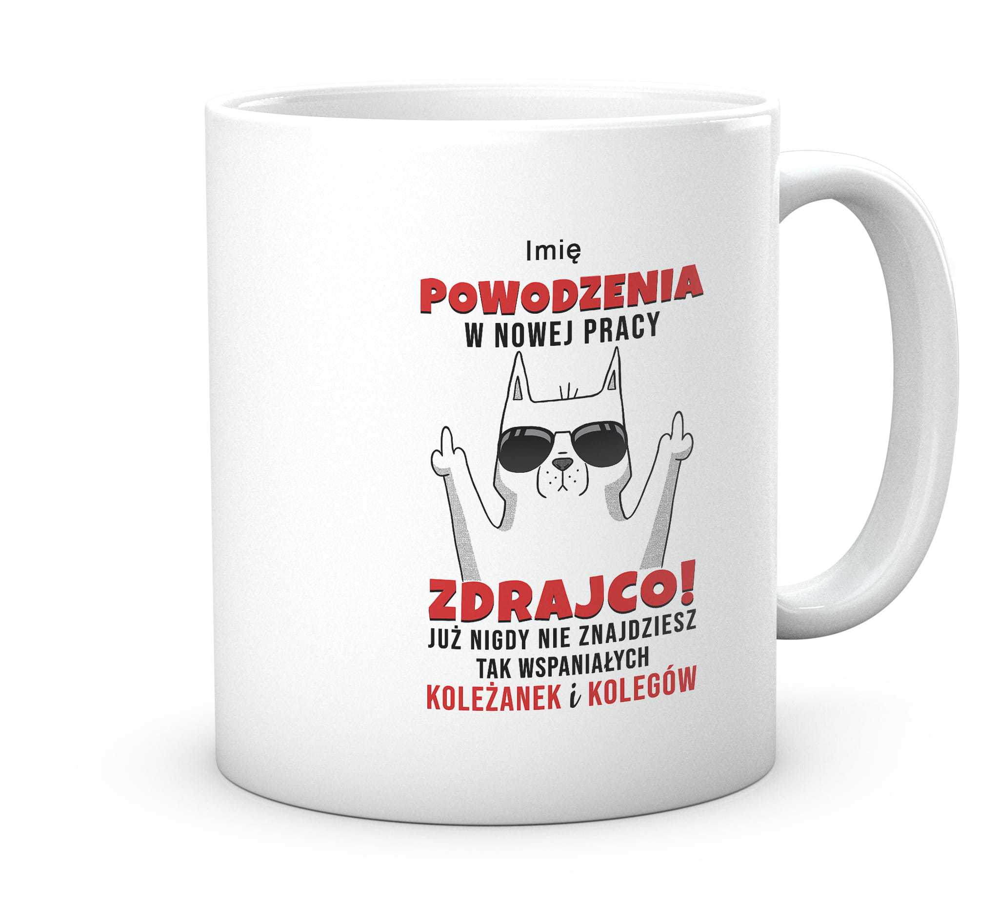 Kubek z nadrukiem zabawnym tekstem prezent do pracy. Powodzenia w nowej pracy zdrajco! Już nigdy nie znajdziesz tak wspaniałych koleżanek i kolegów. Inne warianty to koleżanek lub kolegów.