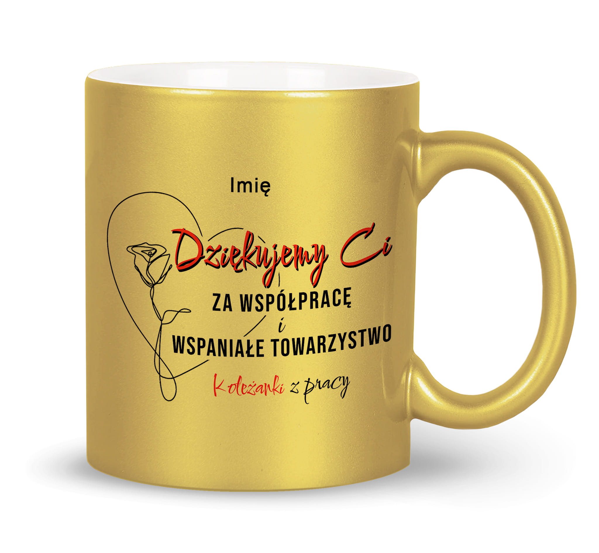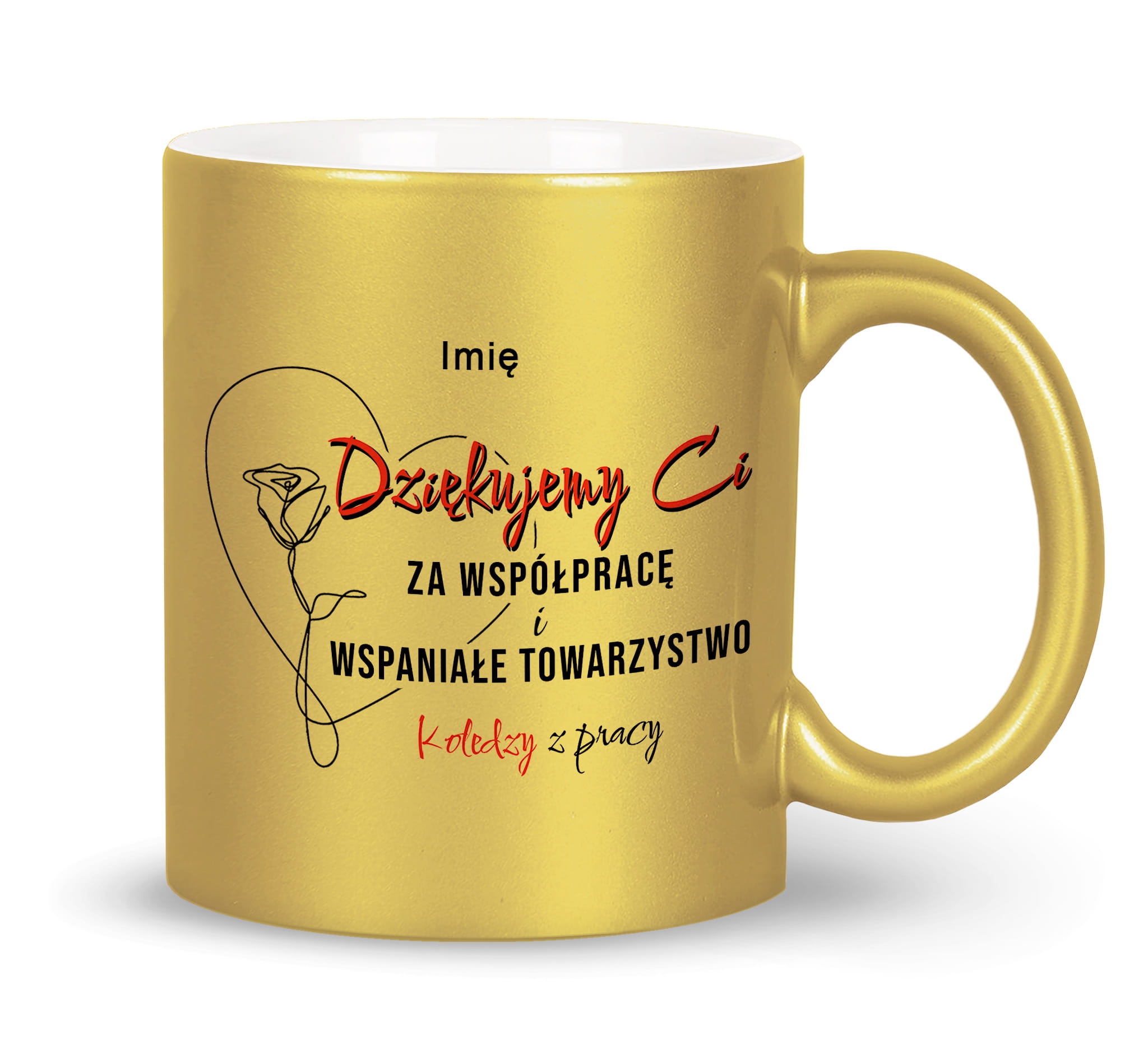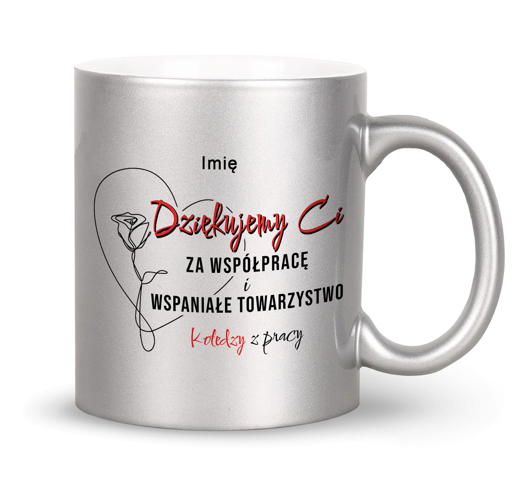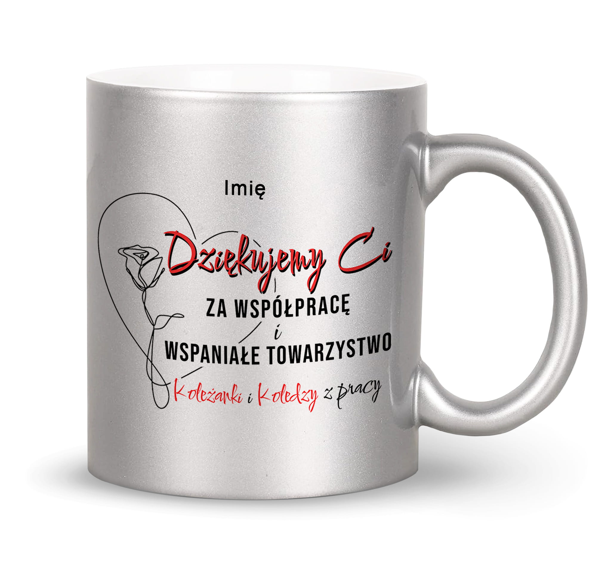 Biały, srebrny, złoty kubek z nadrukiem prezent na pożegnanie spółpracownika koleżanki kolegi.