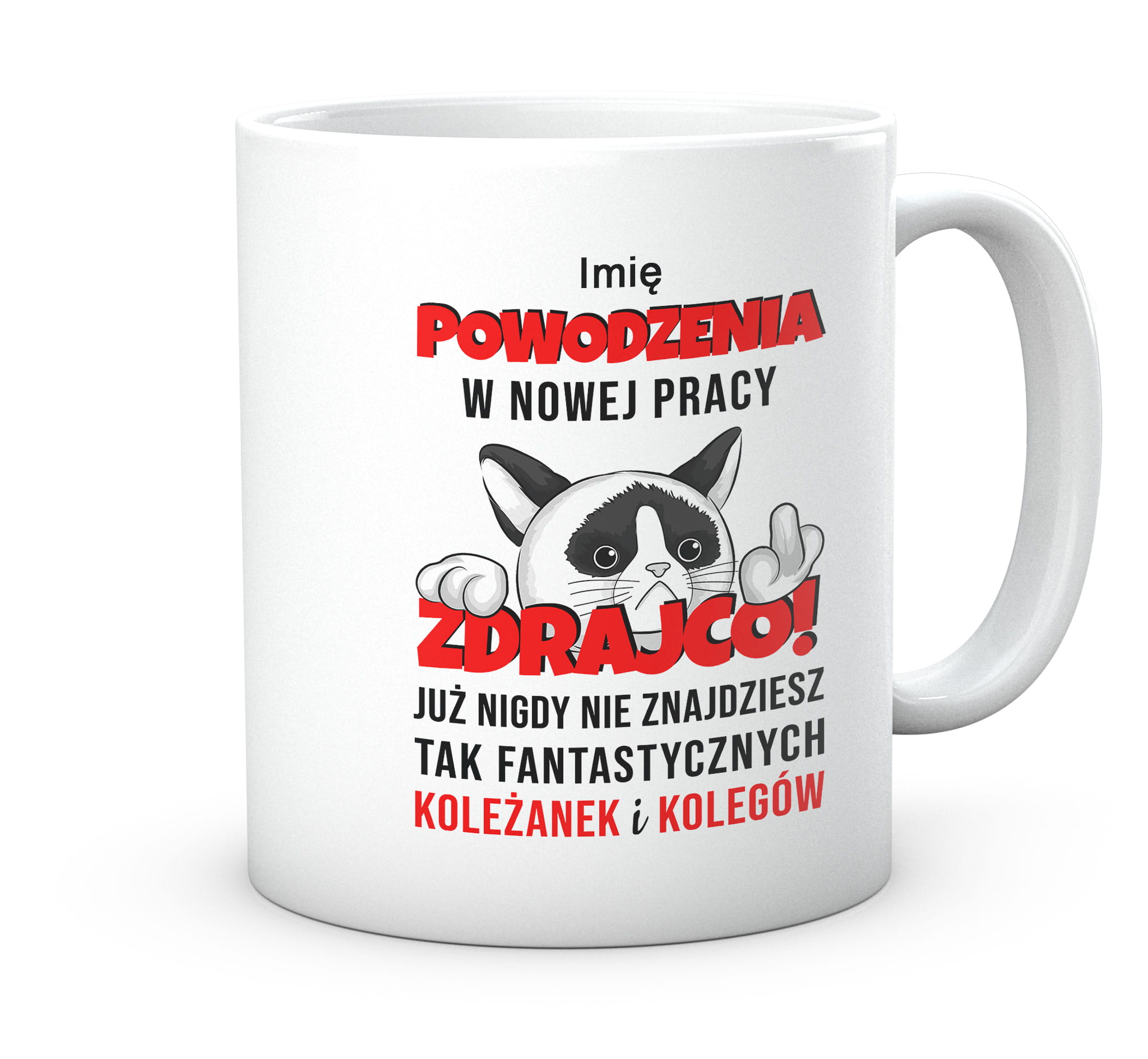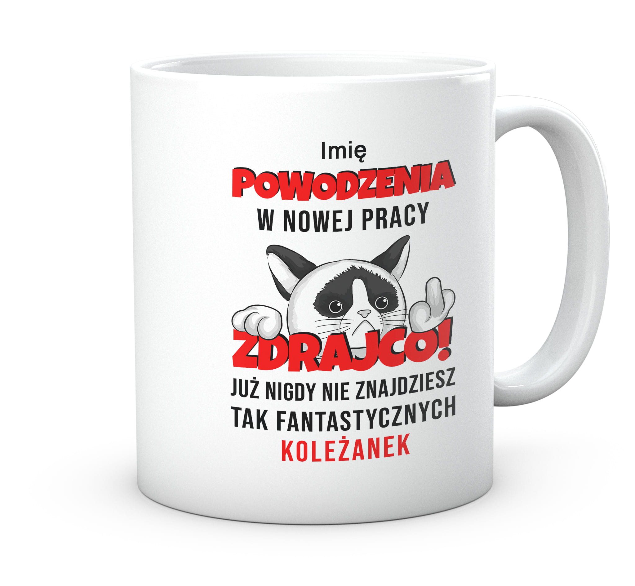 Tekst na kubku "Powodzenia w nowej pracy. Zdrajca. Już nigdy nie znajdziesz tak fantastycznych koleżanek i kolegów".