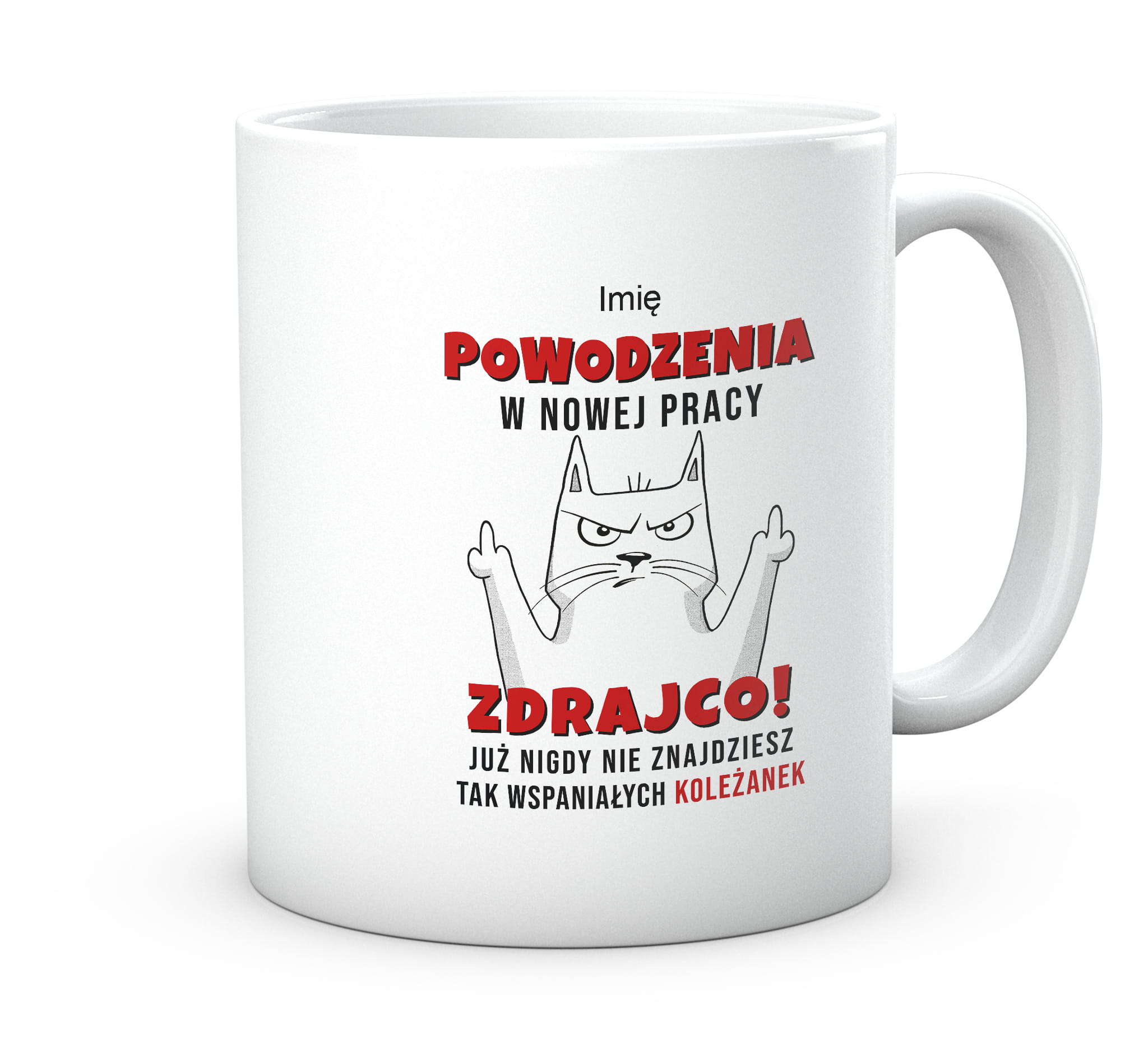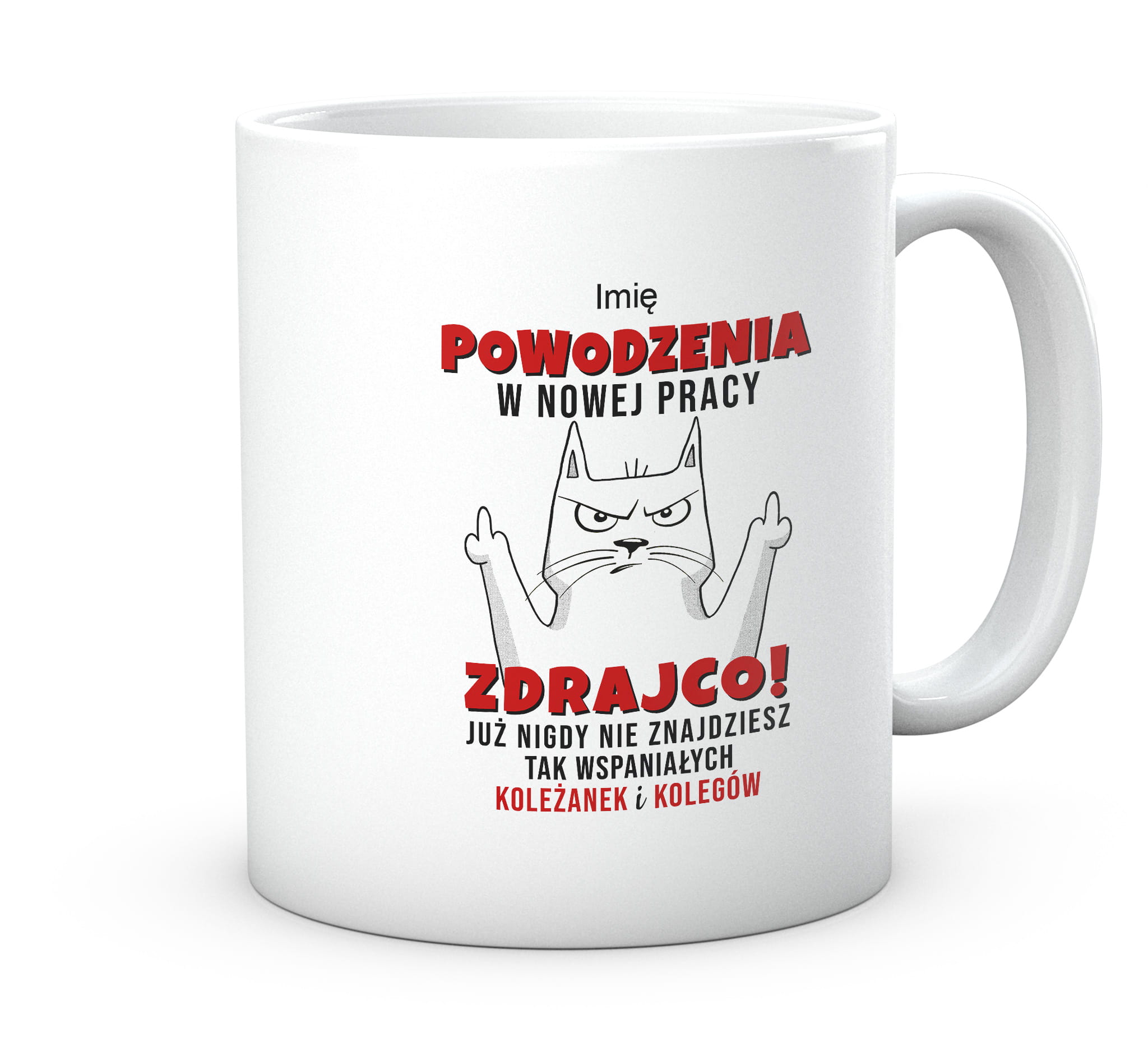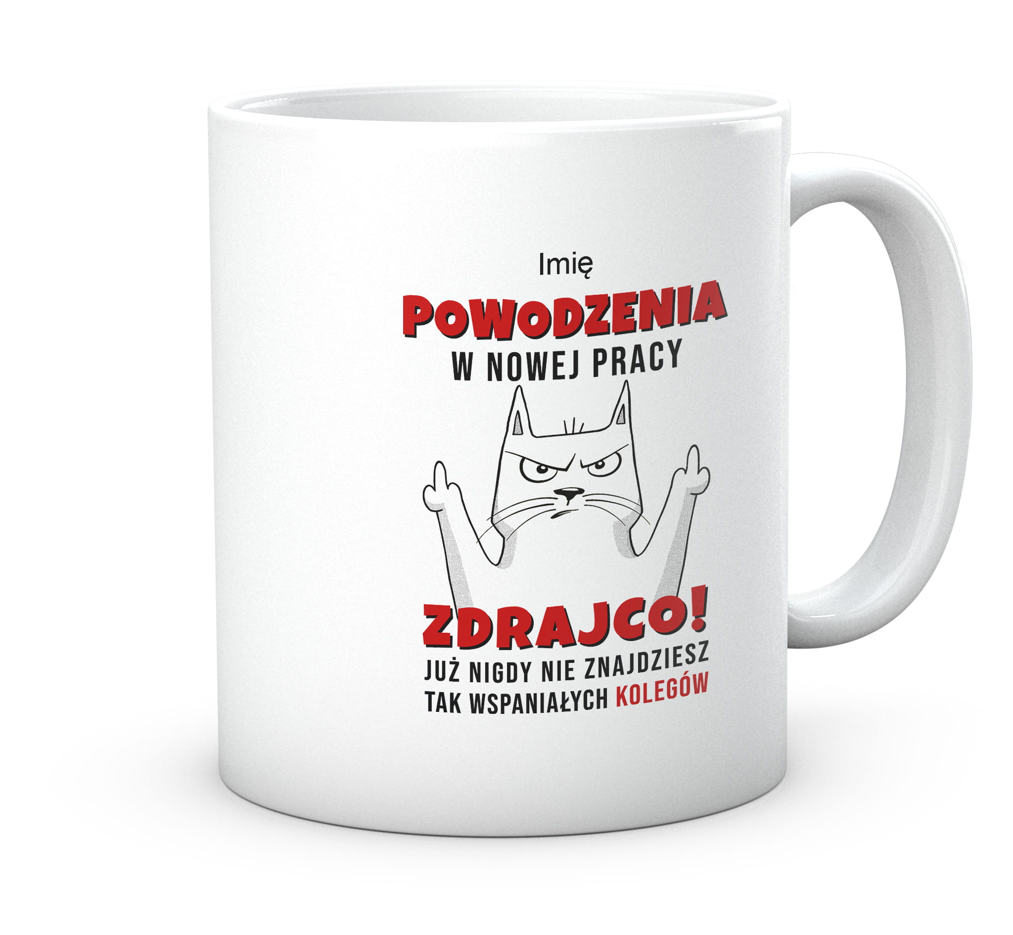 Powodzenia w nowej pracy. Kot Zdrajca. Kubek z nadrukiem zabawnym tekstem prezent do pracy.