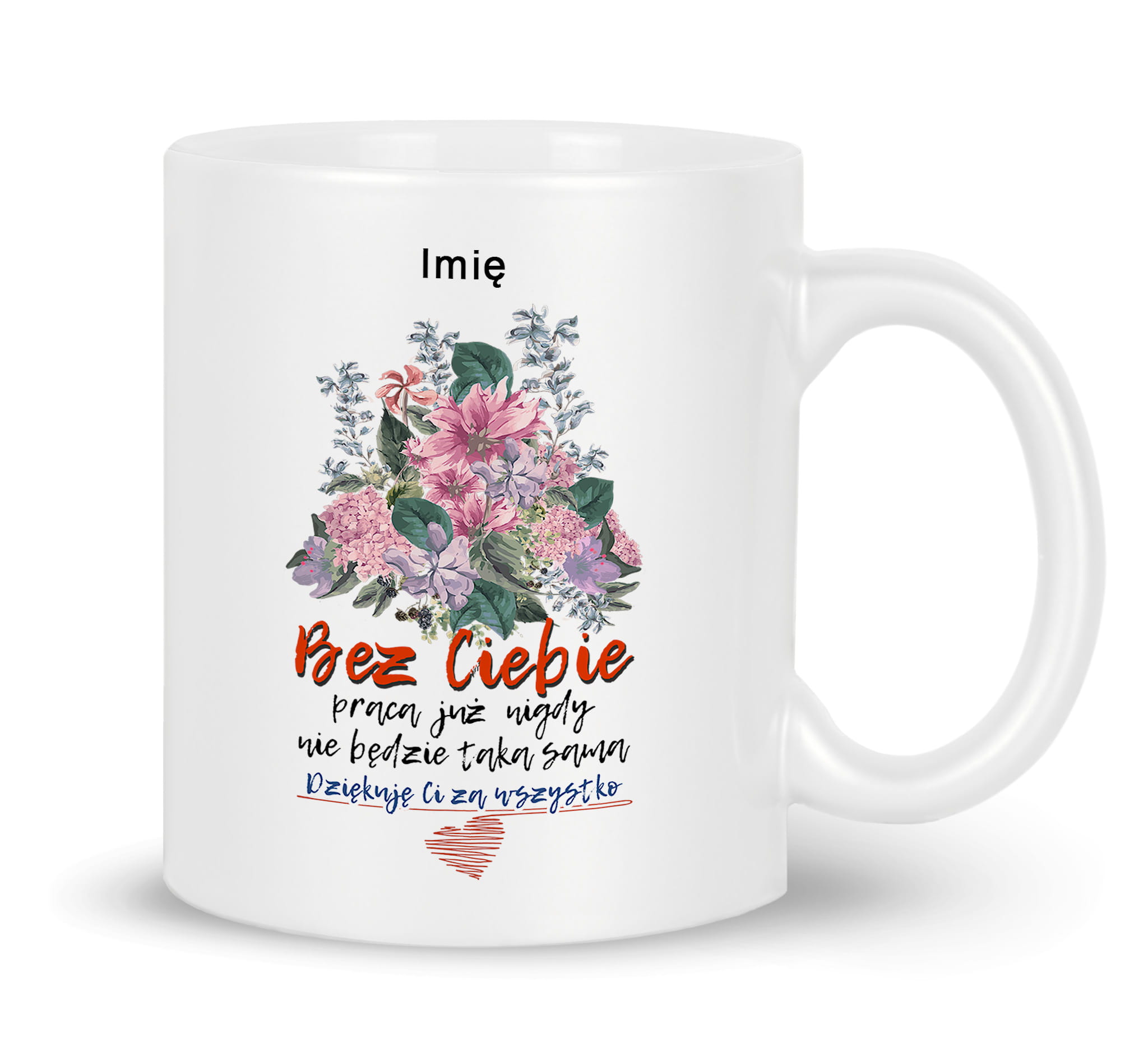 Prezent pożegnanie koleżanki kolegi z pracy. Kubek z nadrukiem bukietu kwiatów.