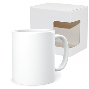 Każdy kubek zapakowany jest w kartonik z fasonowy z okienkiem. Okienko ukazuje nadruk na zapakowanym kubku.
