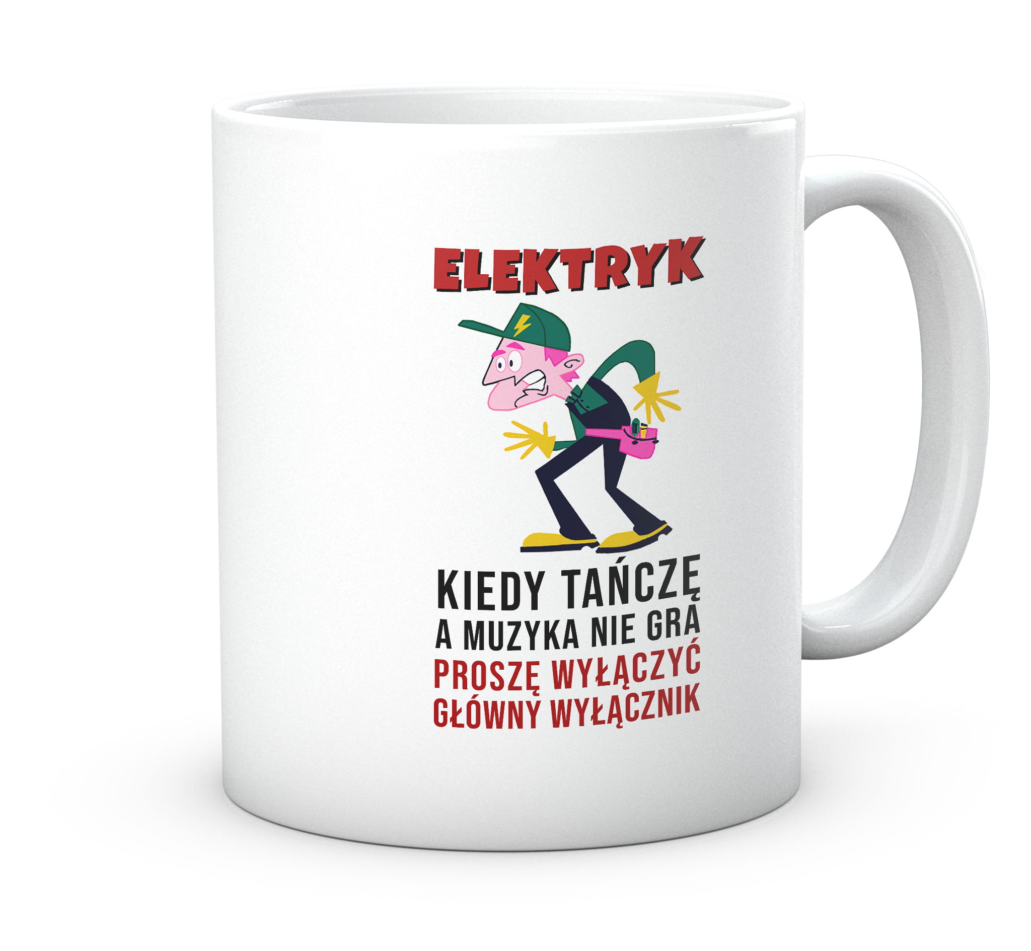 Kubek z nadrukiem zabawnej grafiki prezent do pracy. Elektryk - Kiedy tańczę a muzyka nie gra, proszę wyłączyć główny wyłącznik.